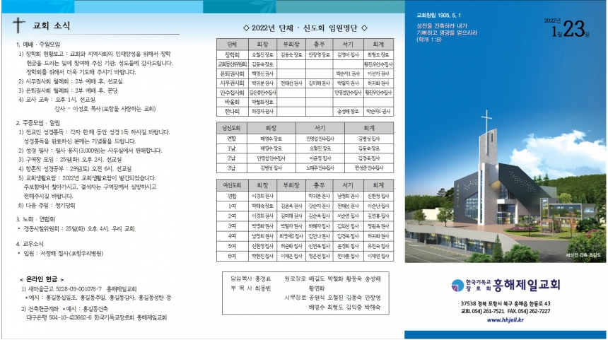 1. ¿¹¹è ¡¤ ÁÖÀϸðÀÓ 1) ÀåÇÐȸ ÇöȲº¸°í : ±³È¸¿Í Áö¿ª»çȸÀÇ ÀÎÀç¾ç¼ºÀ» À§Çؼ ÀåÇÐ Çå±ÝÀ» µå¸®´Â ÀÏ¿¡ Âü¿©ÇØ Áֽбâ°ü, ¼ºµµµé²² °¨»çµå¸³´Ï´Ù. ÀåÇÐȸ¸¦ À§Çؼ ´õ¿í ±âµµÇØ Áֽñ⠹ٶø´Ï´Ù. 2) ½Ã¹«±Ç»çȸ ¿ù·Êȸ : 2ºÎ ¿¹¹è ÈÄ, ¼±±³½Ç 3) ÀºÅð±Ç»çȸ ¿ù·Êȸ : 2ºÎ ¿¹¹è ÈÄ, º»´ç 4) ±³»ç ±³À° : ¿ÀÈÄ 1½Ã, ¼±±³½Ç. °»ç – À̼ºÈ£ ¸ñ»ç(Æ÷Ç×À» »ç¶ûÇÏ´Â ±³È¸) 2. ÁÖÁ߸ðÀÓ ¡¤ ¾Ë¸² 1) Àü±³ÀÎ ¼º°æÅëµ¶ : °¢ÀÚ ÇÑÇØ µ¿¾È ¼º°æ1µ¶ ÇÏ½Ã±æ ¹Ù¶ø´Ï´Ù. ¼º°æÅëµ¶À» ¿Ï·áÇϽŠºÐ²²´Â ±â³äǰÀ» µå¸³´Ï´Ù. 2) ¼º°æ ÇÊ»ç : ÇÊ»ç ¿ëÁö(3,000¿ø)´Â »ç¹«½Ç¿¡¼ ÆÇ¸ÅÇÕ´Ï´Ù. 3) ±¸¿ªÀå ¸ðÀÓ : 25ÀÏ(È) ¿ÀÈÄ 2½Ã, ¼±±³½Ç 4) Ç×Á¸Á÷ ¼º°æ°øºÎ : 29ÀÏ(Åä) ¿ÀÀü 6½Ã, ¼±±³½Ç 5) ±³È¸»ýȰ¿ä¶÷ : 2022³â ±³È¸»ýȰ¿ä¶÷ÀÌ ¹ß°£µÇ¾ú½À´Ï´Ù. ÁÖº¸ÇÔ¿¡¼ ã¾Æ°¡½Ã°í, °á¼®ÀÚ´Â ±¸¿ªÀå²²¼ ½É¹æÇϽðí ÀüÇØÁÖ½Ã±æ ¹Ù¶ø´Ï´Ù. 6) ´ÙÀ½ ÁÖÀÏ : Á¤±â´çȸ 3. ³ëȸ ¡¤ ¿¬ÇÕȸ ⦁ °æµ¿½ÃÂûÀ§¿øÈ¸ : 25ÀÏ(È) ¿ÀÈÄ 4½Ã, ¿ì¸® ±³È¸ 4. ±³¿ì¼Ò½Ä ⦁ ÀÔ¿ø : ¼Á¤¹è Áý»ç(Æ÷Ç׿츮º´¿ø) < ¿Â¶óÀÎ Çå±Ý > 1) »õ¸¶À»±Ý°í 5228-09-001078-7 ÈïÇØÁ¦Àϱ³È¸ £ª¿¹½Ã : È«±æµ¿½ÊÀÏÁ¶, È«±æµ¿ÁÖÀÏ, È«±æµ¿°¨»ç, È«±æµ¿¼ºÅº µî 2) °ÇÃàÇå±Ý°èÁ £ª¿¹½Ã : È«±æµ¿°ÇÃà ´ë±¸ÀºÇà 504-10-423662-6 Çѱ¹±âµ¶±³Àå·Îȸ ÈïÇØÁ¦Àϱ³È¸