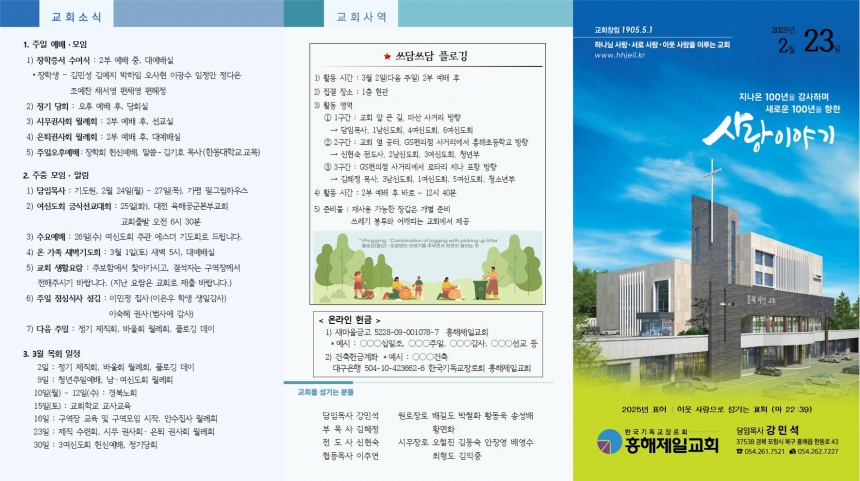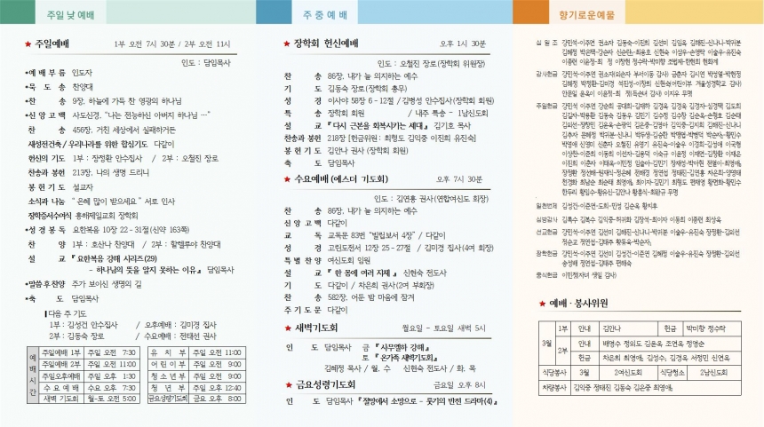 1. ÁÖÀÏ ¿¹¹è¡¤¸ðÀÓ 1) ÀåÇÐÁõ¼ ¼ö¿©½Ä : 2ºÎ ¿¹¹è Áß, ´ë¿¹¹è½Ç ⦁ ÀåÇлý – ±è¹Î¼º ±è¿¹Áö ¹ÚÇÏÀÓ ¿À»çÇö À̱¤¼ö ÀÓÁ¤¾È Á¤´ÙÀº Á¶¿¹Âù 伿µ Æí俵 ÆíÇýÁ¤ 2) Á¤±â ´çȸ : ¿ÀÈÄ ¿¹¹è ÈÄ, ´çȸ½Ç 3) ½Ã¹«±Ç»çȸ ¿ù·Êȸ : 2ºÎ ¿¹¹è ÈÄ, ¼±±³½Ç 4) ÀºÅð±Ç»çȸ ¿ù·Êȸ : 2ºÎ ¿¹¹è ÈÄ, ´ë¿¹¹è½Ç 5) ÁÖÀÏ¿ÀÈÄ¿¹¹è:ÀåÇÐȸ Çå½Å¿¹¹è, ¸»¾¸-±è±âÈ£ ¸ñ»ç(Çѵ¿´ëÇб³±³¸ñ) 2. ÁÖÁß ¸ðÀÓ ¡¤ ¾Ë¸² 1) ´ãÀÓ¸ñ»ç : ±âµµ¿ø, 2¿ù 24ÀÏ(¿ù) - 27ÀÏ(¸ñ), °¡Æò Çʱ׸²ÇϿ콺 2) ¿©½ÅµµÈ¸ ±Ý½Ä¼±±³´ëȸ : 25ÀÏ(È), ´ëÀü À°Çذø±ºº»ºÎ±³È¸ ±³È¸Ãâ¹ß ¿ÀÀü 6½Ã 30ºÐ 3) ¼ö¿ä¿¹¹è : 26ÀÏ(¼ö) ¿©½ÅµµÈ¸ ÁÖ°ü ¿¡½º´õ ±âµµÈ¸·Î µå¸³´Ï´Ù. 4) ¿Â °¡Á· »õº®±âµµÈ¸ : 3¿ù 1ÀÏ(Åä) »õº® 5½Ã, ´ë¿¹¹è½Ç 5) ±³È¸ »ýȰ¿ä¶÷ : ÁÖº¸ÇÔ¿¡¼ ã¾Æ°¡½Ã°í, °á¼®ÀÚ´Â ±¸¿ªÀå²²¼ ÀüÇØÁֽñ⠹ٶø´Ï´Ù. (Áö³ ¿ä¶÷Àº ±³È¸·Î Á¦Ãâ ¹Ù¶ø´Ï´Ù.) 6) ÁÖÀÏ Á¡½É½Ä»ç ¼¶±è : À̹ÎÁ¤ Áý»ç(ÀÌÀº¿ì Çлý »ýÀϰ¨»ç) À̼÷Çý ±Ç»ç(¹ü»ç¿¡ °¨»ç) 7) ´ÙÀ½ ÁÖÀÏ : Á¤±â Á¦Á÷ȸ, ¹Ù¿ïȸ ¿ù·Êȸ, ÇÃ·Î±ë µ¥ÀÌ 3. 3¿ù ¸ñȸ ÀÏÁ¤ 2ÀÏ : Á¤±â Á¦Á÷ȸ, ¹Ù¿ïȸ ¿ù·Êȸ, ÇÃ·Î±ë µ¥ÀÌ 9ÀÏ : û³âÁÖÀÏ¿¹¹è, ³²¡¤¿©½ÅµµÈ¸ ¿ù·Êȸ 10ÀÏ(¿ù) - 12ÀÏ(¼ö) : °æºÏ³ëȸ 15ÀÏ(Åä) : ±³È¸Çб³ ±³»ç±³À° 16ÀÏ : ±¸¿ªÀå ±³À° ¹× ±¸¿ª¸ðÀÓ ½ÃÀÛ, ¾È¼öÁý»ç ¿ù·Êȸ 23ÀÏ : Á¦Á÷ ¼ö·Ãȸ, ½Ã¹« ±Ç»çȸ¡¤ ÀºÅð ±Ç»çȸ ¿ù·Êȸ 30ÀÏ : 3¿©½ÅµµÈ¸ Çå½Å¿¹¹è, Á¤±â´çȸ