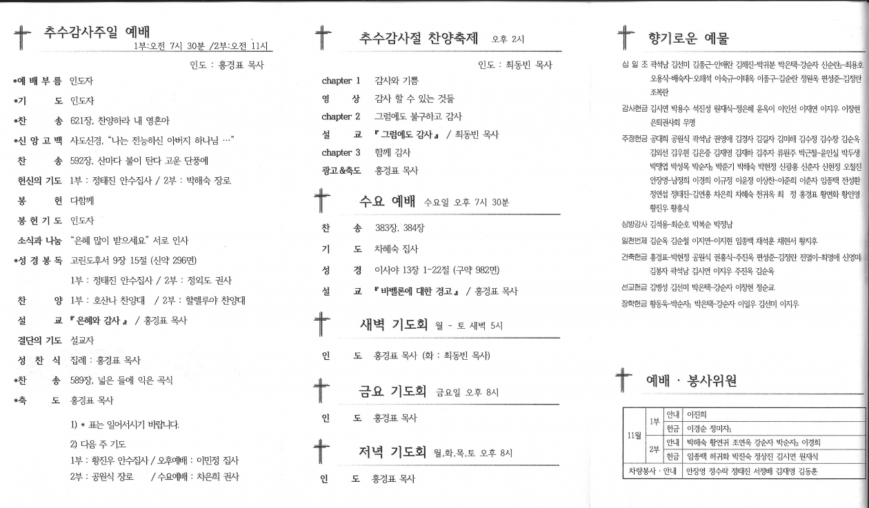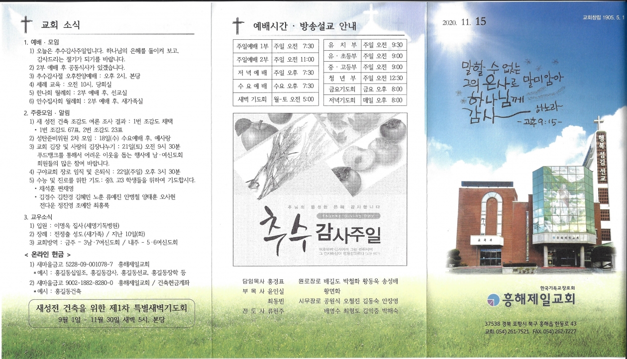 1. ¿¹¹è ¡¤ ¸ðÀÓ 1) ¿À´ÃÀº Ãß¼ö°¨»çÁÖÀÏÀÔ´Ï´Ù. Çϳª´ÔÀÇ ÀºÇý¸¦ µ¹ÀÌÄÑ º¸°í, °¨»çµå¸®´Â Àý±â°¡ µÇ±â¸¦ ¹Ù¶ø´Ï´Ù. 2) 2ºÎ ¿¹¹è ÈÄ °øµ¿½Ä»ç°¡ ÀÖ°Ú½À´Ï´Ù. 3) Ãß¼ö°¨»çÀý ¿ÀÈÄÂù¾ç¿¹¹è : ¿ÀÈÄ 2½Ã, º»´ç 4) ¼¼·Ê ±³À° : ¿ÀÀü 10½Ã, ´çȸ½Ç 5) ÇѳªÈ¸ ¿ù·Êȸ : 2ºÎ ¿¹¹è ÈÄ, ¼±±³½Ç 6) ¾È¼öÁý»çȸ ¿ù·Êȸ : 2ºÎ ¿¹¹è ÈÄ, »õ°¡Á·½Ç
