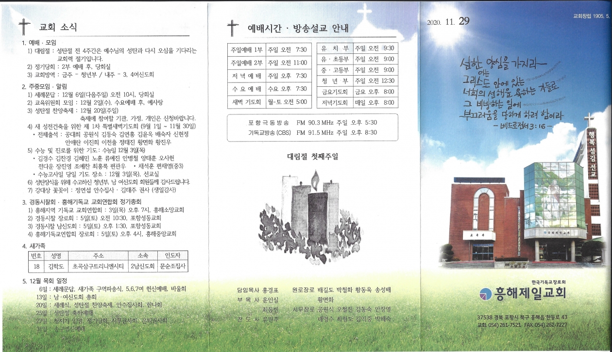 1. ¿¹¹è ¡¤ ¸ðÀÓ 1) ´ë¸²Àý : ¼ºÅºÀý Àü 4ÁÖ°£Àº ¿¹¼ö´ÔÀÇ ¼ºÅº°ú ´Ù½Ã ¿À½ÉÀ» ±â´Ù¸®´Â ±³È¸·Â Àý±âÀÔ´Ï´Ù. 2) Á¤±â´çȸ : 2ºÎ ¿¹¹è ÈÄ, ´çȸ½Ç 3) ±³È¸¹æ¿ª : ±ÝÁÖ – û³âºÎ / ³»ÁÖ – 3, 4¿©½ÅµµÈ¸