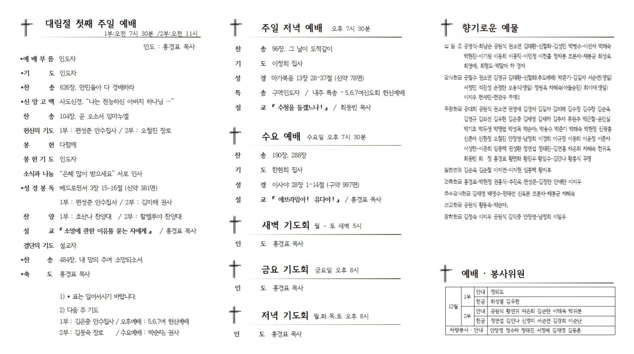 5. 12¿ù ¸ñȸ ÀÏÁ¤ 6ÀÏ : ¼¼·Ê¹®´ä, »õ°¡Á· ±¸¿ªÆÄ¼Û½Ä, 5,6,7¿© Çå½Å¿¹¹è, ¹Ù¿ïȸ 13ÀÏ : ³² ¡¤ ¿©½ÅµµÈ¸ ÃÑȸ 20ÀÏ : ¼¼·Ê½Ä, ¼ºÅºÀý Âù¾çÃàÁ¦, ¾È¼öÁý»çȸ, ÇѳªÈ¸ 25ÀÏ : ¼ºÅºÀý ÃàÇÏ¿¹¹è 27ÀÏ : ûÁö±â ÀÓ¸í, Á¤±â´çȸ, ½Ã¹«±Ç»çȸ, ÀºÅð±Ç»çȸ 31ÀÏ : ¼Û±¸¿µ½Å¿¹¹è