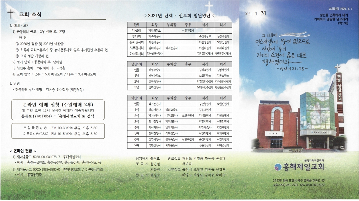 1. ¿¹¹è ¡¤ ¸ðÀÓ 1) °øµ¿ÀÇȸ °ø°í : 2ºÎ ¿¹¹è ÈÄ, º»´ç - ¾È °Ç ¨ç 2020³â °á»ê ¹× 2021³â ¿¹»ê¾È ¨è Ãʰ ±³È¸¼ÒÀ¯ºÎÁö Áß ³ó¾îÃ̰ø»ç·Î ÀϺΠÃß°¡ÆíÀÔ ¼ö¿ëÀÇ °Ç ¨é ±³È¸ Á¤°ü °³Á¤ÀÇ °Ç 2) Á¤±â ´çȸ : °øµ¿ÀÇȸ ÈÄ, ´çȸ½Ç 3) û³âºÎ ÃÑȸ : 2ºÎ ¿¹¹è ÈÄ, ³ë¼®È¦ 4) ±³È¸ ¹æ¿ª : ±ÝÁÖ – 5,6¿©½ÅµµÈ¸ / ³»ÁÖ – 3,4¿©½ÅµµÈ¸