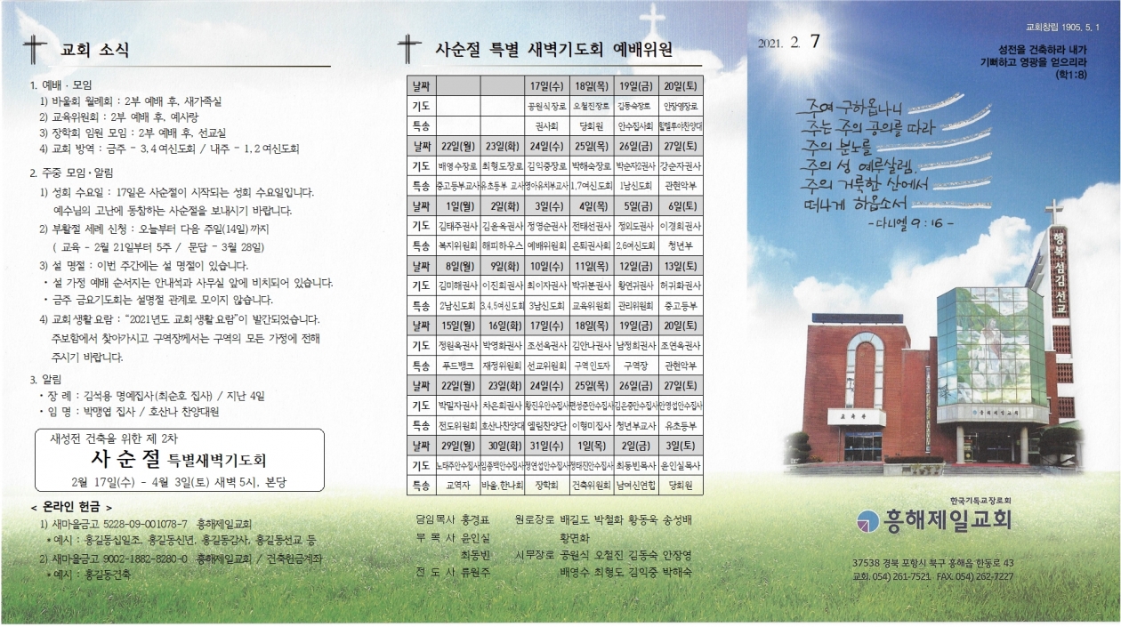 2. ÁÖÁ߸ðÀÓ・¾Ë¸² 1) ¼ºÈ¸ ¼ö¿äÀÏ : 17ÀÏÀº »ç¼øÀýÀÌ ½ÃÀ۵Ǵ ¼ºÈ¸ ¼ö¿äÀÏÀÔ´Ï´Ù. ¿¹¼ö´ÔÀÇ °í³¿¡ µ¿ÂüÇÏ´Â »ç¼øÀýÀ» º¸³»½Ã±â ¹Ù¶ø´Ï´Ù. 2) ºÎȰÀý ¼¼·Ê ½Åû : ¿À´ÃºÎÅÍ ´ÙÀ½ ÁÖÀÏ(14ÀÏ)±îÁö (±³À° - 2¿ù 21ÀϺÎÅÍ 5ÁÖ / ¹®´ä – 3¿ù 28ÀÏ) 3) ¼³ ¸íÀý : À̹ø ÁÖ°£¿¡´Â ¼³ ¸íÀýÀÌ ÀÖ½À´Ï´Ù. • ¼³ °¡Á¤ ¿¹¹è ¼ø¼Áö´Â ¾È³»¼®°ú »ç¹«½Ç ¾Õ¿¡ ºñÄ¡µÇ¾î ÀÖ½À´Ï´Ù. • ±ÝÁÖ ±Ý¿ä±âµµÈ¸´Â ¼³¸íÀý °ü°è·Î ¸ðÀÌÁö ¾Ê½À´Ï´Ù. 4) ±³È¸»ýȰ¿ä¶÷ : ¡°2021³âµµ ±³È¸»ýȰ¿ä¶÷¡±ÀÌ ¹ß°£µÇ¾ú½À´Ï´Ù. ÁÖº¸ÇÔ¿¡¼ ã¾Æ°¡½Ã°í ±¸¿ªÀå²²¼´Â ±¸¿ªÀÇ ¸ðµç °¡Á¤¿¡ ÀüÇØ Áֽñ⠹ٶø´Ï´Ù.