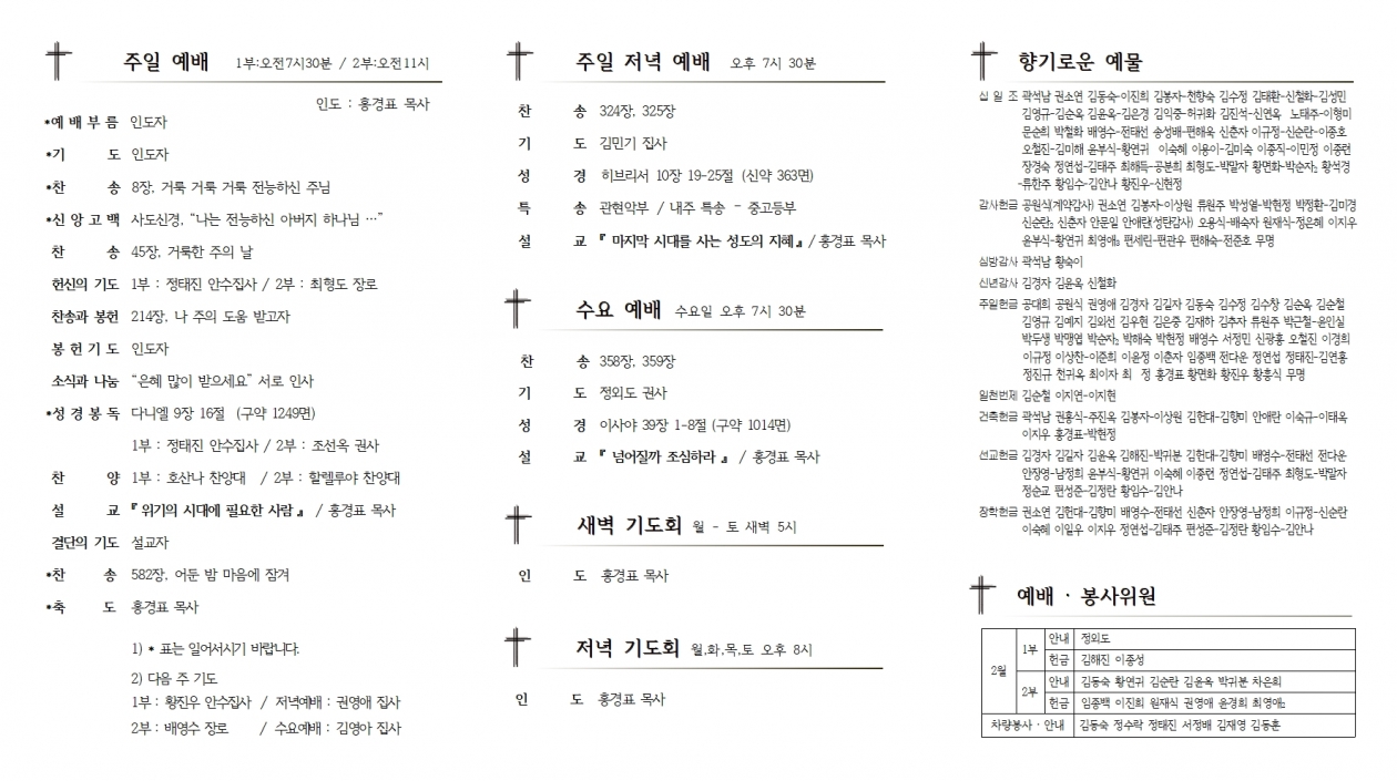 1. ¿¹¹è ¡¤ ¸ðÀÓ 1) ¹Ù¿ïȸ ¿ù·Êȸ : 2ºÎ ¿¹¹è ÈÄ, »õ°¡Á·½Ç 2) ±³À°À§¿øÈ¸ : 2ºÎ ¿¹¹è ÈÄ, ¿¹»ç¶û 3) ÀåÇÐȸ ÀÓ¿ø ¸ðÀÓ : 2ºÎ ¿¹¹è ÈÄ, ¼±±³½Ç 4) ±³È¸ ¹æ¿ª : ±ÝÁÖ – 3,4¿©½ÅµµÈ¸ / ³»ÁÖ – 1,2¿©½ÅµµÈ¸