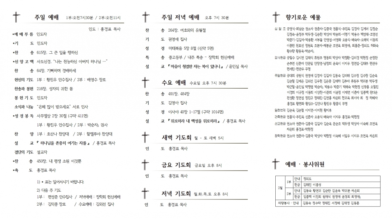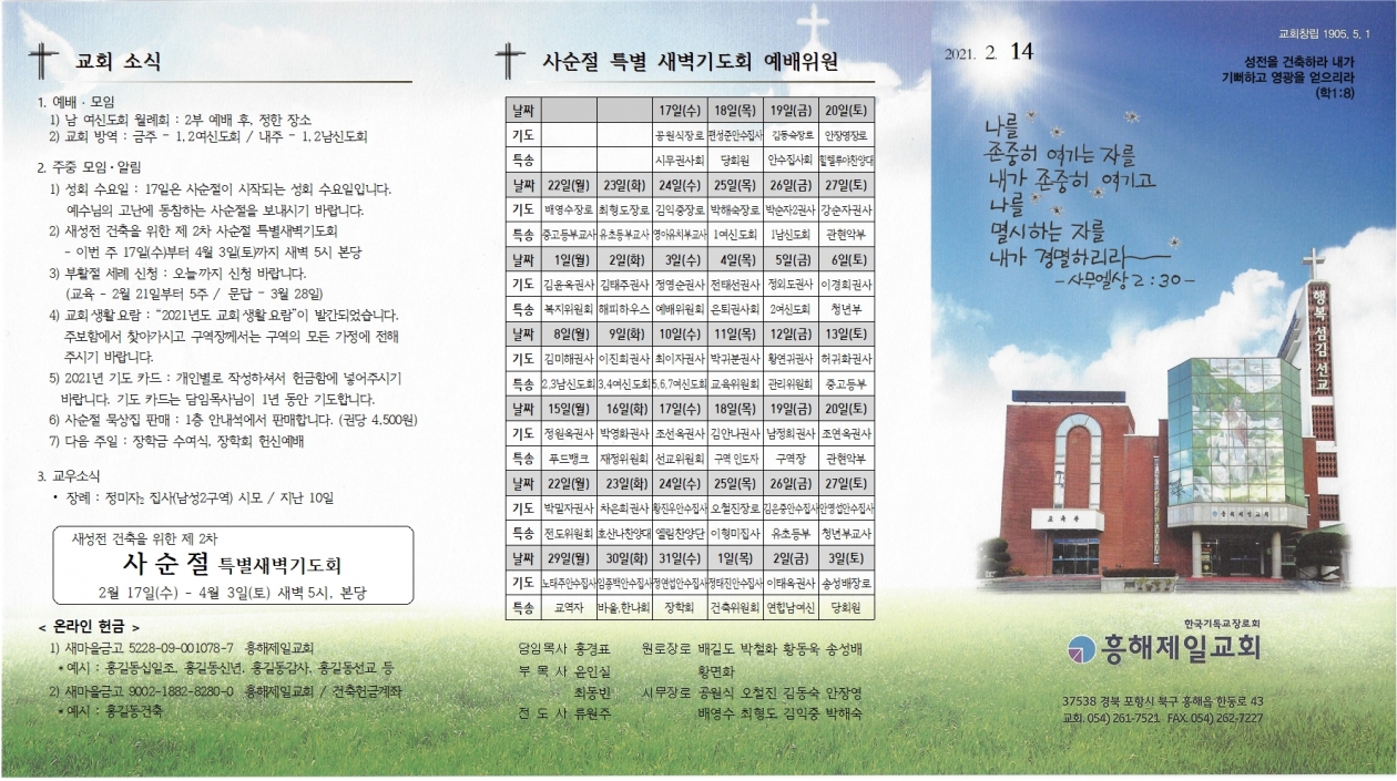 2. ÁÖÁ߸ðÀÓ・¾Ë¸² 1) ¼ºÈ¸ ¼ö¿äÀÏ : 17ÀÏÀº »ç¼øÀýÀÌ ½ÃÀ۵Ǵ ¼ºÈ¸ ¼ö¿äÀÏÀÔ´Ï´Ù. ¿¹¼ö´ÔÀÇ °í³¿¡ µ¿ÂüÇÏ´Â »ç¼øÀýÀ» º¸³»½Ã±â ¹Ù¶ø´Ï´Ù. 2) »õ¼ºÀü °ÇÃàÀ» À§ÇÑ Á¦ 2Â÷ »ç¼øÀý Ưº°»õº®±âµµÈ¸ - À̹ø ÁÖ 17ÀÏ(¼ö)ºÎÅÍ 4¿ù 3ÀÏ(Åä)±îÁö »õº® 5½Ã º»´ç 3) ºÎȰÀý ¼¼·Ê ½Åû : ¿À´Ã±îÁö ½Åû ¹Ù¶ø´Ï´Ù. (±³À° - 2¿ù 21ÀϺÎÅÍ 5ÁÖ / ¹®´ä – 3¿ù 28ÀÏ) 4) ±³È¸»ýȰ¿ä¶÷ : ¡°2021³âµµ ±³È¸»ýȰ¿ä¶÷¡±ÀÌ ¹ß°£µÇ¾ú½À´Ï´Ù. ÁÖº¸ÇÔ¿¡¼ ã¾Æ°¡½Ã°í ±¸¿ªÀå²²¼´Â ±¸¿ªÀÇ ¸ðµç °¡Á¤¿¡ ÀüÇØ Áֽñ⠹ٶø´Ï´Ù. 5) 2021³â ±âµµ Ä«µå : °³Àκ°·Î ÀÛ¼ºÇϼż Çå±ÝÇÔ¿¡ ³Ö¾îÁֽñ⠹ٶø´Ï´Ù. ±âµµ Ä«µå´Â ´ãÀÓ¸ñ»ç´ÔÀÌ 1³â µ¿¾È ±âµµÇÕ´Ï´Ù. 6) »ç¼øÀý ¹¬»óÁý ÆÇ¸Å : 1Ãþ ¾È³»¼®¿¡¼ ÆÇ¸ÅÇÕ´Ï´Ù. (±Ç´ç 4,500¿ø) 7) ´ÙÀ½ ÁÖÀÏ : ÀåÇÐ±Ý ¼ö¿©½Ä, ÀåÇÐȸ Çå½Å¿¹¹è