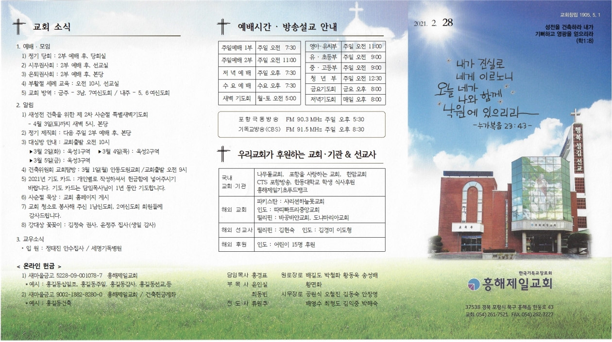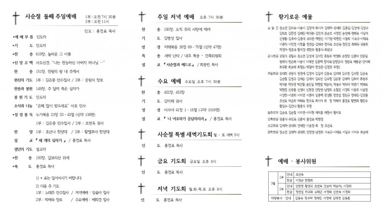 2. ¾Ë¸² 1) »õ¼ºÀü °ÇÃàÀ» À§ÇÑ Á¦ 2Â÷ »ç¼øÀý Ưº°»õº®±âµµÈ¸ - 4¿ù 3ÀÏ(Åä)±îÁö »õº® 5½Ã, º»´ç 2) Á¤±â Á¦Á÷ȸ : ´ÙÀ½ ÁÖÀÏ 2ºÎ ¿¹¹è ÈÄ, º»´ç 3) ´ë½É¹æ ¾È³» : ±³È¸Ãâ¹ß ¿ÀÀü 10½Ã ¢º3¿ù 2ÀÏ(È) : ¿Á¼º1±¸¿ª ¢º3¿ù 4ÀÏ(¸ñ) : ¿Á¼º2±¸¿ª ¢º3¿ù 5ÀÏ(±Ý) : ¿Á¼º3±¸¿ª 4) °ÇÃàÀ§¿øÈ¸ ±³È¸Å½¹æ : 3¿ù 1ÀÏ(¿ù) ¾Èµ¿µµ¿ø±³È¸ / ±³È¸Ãâ¹ß ¿ÀÀü 9½Ã 5) 2021³â ±âµµ Ä«µå : °³Àκ°·Î ÀÛ¼ºÇϼż Çå±ÝÇÔ¿¡ ³Ö¾îÁֽñ⠹ٶø´Ï´Ù. ±âµµ Ä«µå´Â ´ãÀÓ¸ñ»ç´ÔÀÌ 1³â µ¿¾È ±âµµÇÕ´Ï´Ù. 6) »ç¼øÀý ¹¬»ó : ±³È¸ ȨÆäÀÌÁö °Ô½Ã 7) ±³È¸ û¼Ò·Î ºÀ»çÇØ ÁֽŠ1³²½ÅµµÈ¸, 2¿©½ÅµµÈ¸ ȸ¿øµé²² °¨»çµå¸³´Ï´Ù. 8) °´ë»ó ²É²ÈÀÌ : ±èÁ¤¼÷ ±Ç»ç, À±Á¤ÁÖ Áý»ç(»ýÀÏ °¨»ç)