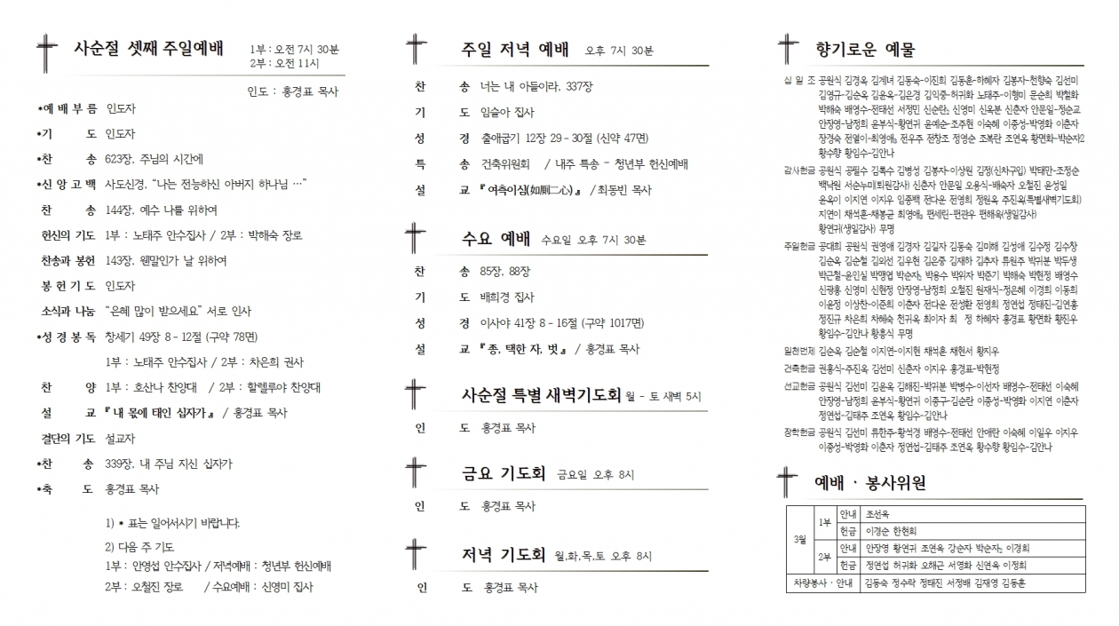 2. ¾Ë¸² 1) »õ¼ºÀü °ÇÃàÀ» À§ÇÑ Á¦ 2Â÷ »ç¼øÀý Ưº°»õº®±âµµÈ¸ - 4¿ù 3ÀÏ(Åä)±îÁö »õº® 5½Ã, º»´ç 2) ´ë½É¹æ ¾È³» : ±³È¸ Ãâ¹ß ¿ÀÀü 10½Ã ¢º 9ÀÏ(È) : ¸¶»ê1±¸¿ª ¢º 11ÀÏ(¸ñ) : ¸¶»ê3±¸¿ª ¢º 12ÀÏ(±Ý) : ¸¶»ê2±¸¿ª 3) Àü±³ÀÎÀÌ ÇÔ²²ÇÏ´Â »ç¼øÀý ¹¬»ó : ±³È¸ ȨÆäÀÌÁö ¸ñ¾çÄ®·³¶õ 4) Çå ¹° : °ø¿ø½Ä Àå·Î / °ø±âûÁ¤±â (¿µ¾Æ ¡¤ À¯Ä¡ºÎ½Ç) 5) Áß°íµîºÎ ±³»ç Ãß°¡ ÀÓ¸í : ³ëÅÂÁÖ ¾È¼öÁý»ç