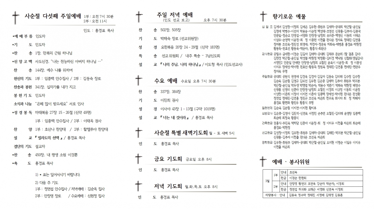 1. ¿¹¹è ¡¤ ¸ðÀÓ 1) Àεµ ¼±±³º¸°í ¿¹¹è : Àú³á ¿¹¹è ½Ã / °»ç - À̵µÇü ¸ñ»ç 2) Àӽà ´çȸ : 2ºÎ ¿¹¹è ÈÄ, ´çȸ½Ç 3) ºÎȰÀý ¼¼·Ê ±³À° : ¿ÀÀü 10½Ã, ´çȸ½Ç ¼¼·Ê ¹®´ä : ´ÙÀ½ ÁÖÀÏ(28ÀÏ), ¿ÀÀü 10½Ã, ´çȸ½Ç 4) ±¸¿ªÀå ±âµµÈ¸ : Àú³á ¿¹¹è ÈÄ, º»´ç 5) ÇѳªÈ¸ : 2ºÎ ¿¹¹è ÈÄ, º»´ç 6) ¾È¼öÁý»çȸ : 2ºÎ ¿¹¹è ÈÄ, »õ°¡Á·½Ç 7) ¿µ¾ÆÀ¯Ä¡ºÎ ±³»ç & Çкθð ¸ðÀÓ : 2ºÎ ¿¹¹è ÈÄ, ¿µ¾ÆÀ¯Ä¡ºÎ½Ç 8) ±³È¸ ¹æ¿ª : ±ÝÁÖ – 1, 2¿©½ÅµµÈ¸ / ³»ÁÖ – 1, 2³²½ÅµµÈ¸ 2. ¾Ë¸² 1) »õ ¼ºÀü °ÇÃàÀ» À§ÇÑ Á¦2Â÷ »ç¼øÀý Ưº°»õº®±âµµÈ¸ - 4¿ù 3ÀÏ(Åä)±îÁö »õº® 5½Ã, º»´ç 2) ´ë½É¹æ ¾È³» : ±³È¸ Ãâ¹ß ¿ÀÀü 10½Ã * 23ÀÏ(È) : Çмº±¸¿ª * 25ÀÏ(¸ñ) : ¾à¼º1±¸¿ª * 26ÀÏ(±Ý) : 1±³±¸ Ãß°¡ ½É¹æ 3) Á¦ 142ȸ °æºÏ³ëȸ ÀÓ¿ø * ³ëȸÀå – ¾ÈÀç´É ¸ñ»ç (¿µÁÖÇູÇÑ) * ºÎ³ëȸÀå – ¿ÀÀç±Ô ¸ñ»ç (Æ÷Ç׿¹°¡), õ±¸Ã¶ Àå·Î (Æ÷Ç×Á¦ÀÌ) * ¼±â – À̸í±Ô ¸ñ»ç (±¸¾ß), ȸ°è – ¾öµ¿¼· Àå·Î (dz±â±³È¸) 4) Àü ±³ÀÎÀÌ ÇÔ²²ÇÏ´Â »ç¼øÀý ¹¬»ó : ±³È¸ ȨÆäÀÌÁö ¸ñ¾çÄ®·³¶õ 5) ±³È¸ û¼Ò·Î ºÀ»çÇØ ÁֽŠ4¿©½ÅµµÈ¸ ȸ¿øµé²² °¨»çµå¸³´Ï´Ù. 6) Âù¾ç ´ë¿ø Ãß°¡ ÀÓ¸í : ½Å¿µ¹Ì Áý»ç(È£»ê³ª Âù¾ç´ë) 7) Ǫµå¹ðÅ© ±âŹ : ÈïÇØ»õ¸¶À»±Ý°í (¹é¹Ì 40kg) < ¿Â¶óÀÎ Çå±Ý > 1) »õ¸¶À»±Ý°í 5228-09-001078-7 ÈïÇØÁ¦Àϱ³È¸ £ª¿¹½Ã : È«±æµ¿½ÊÀÏÁ¶, È«±æµ¿ÁÖÀÏ, È«±æµ¿°¨»ç, È«±æµ¿¼±±³,µî 2) »õ¸¶À»±Ý°í 9002-1882-8280-0 ÈïÇØÁ¦Àϱ³È¸ / °ÇÃàÇå±Ý°èÁ £ª¿¹½Ã : È«±æµ¿°ÇÃà