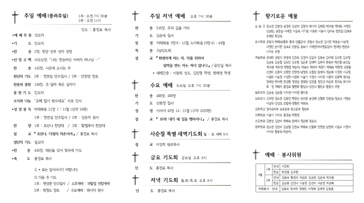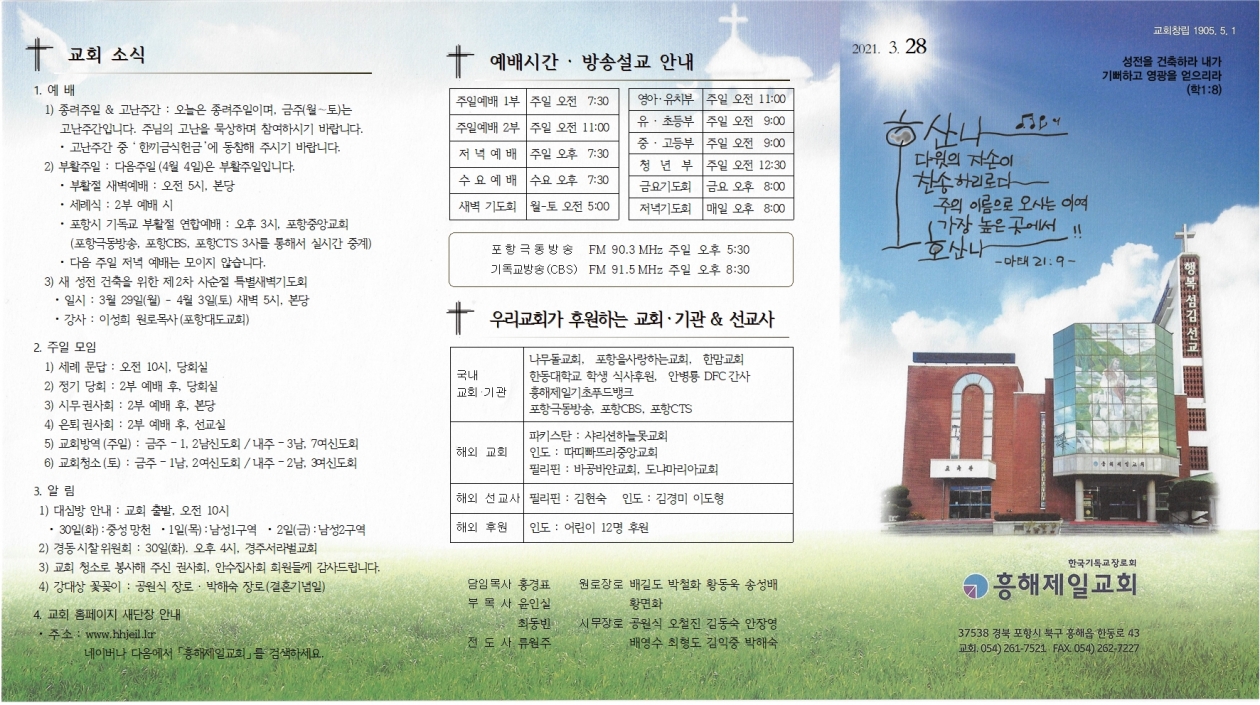 1. ¿¹ ¹è 1) Á¾·ÁÁÖÀÏ & °í³ÁÖ°£ : ¿À´ÃÀº Á¾·ÁÁÖÀÏÀ̸ç, ±ÝÁÖ(¿ù¡Åä)´Â °í³ÁÖ°£ÀÔ´Ï´Ù. ÁÖ´ÔÀÇ °í³À» ¹¬»óÇϸç Âü¿©ÇϽñ⠹ٶø´Ï´Ù. •°í³ÁÖ°£ Áß ¡® Çѳ¢±Ý½ÄÇå±Ý ¡¯¿¡ µ¿ÂüÇØ Áֽñ⠹ٶø´Ï´Ù. 2) ºÎȰÁÖÀÏ : ´ÙÀ½ÁÖÀÏ (4¿ù 4ÀÏ)Àº ºÎȰÁÖÀÏÀÔ´Ï´Ù. •ºÎȰÀý »õº®¿¹¹è : ¿ÀÀü 5½Ã, º»´ç • ¼¼·Ê½Ä : 2ºÎ ¿¹¹è ½Ã •Æ÷Ç׽à ±âµ¶±³ ºÎȰÀý ¿¬ÇÕ¿¹¹è : ¿ÀÈÄ 3½Ã, Æ÷Ç×Áß¾Ó±³È¸ (Æ÷Çױص¿¹æ¼Û, Æ÷Ç×CBS, Æ÷Ç×CTS 3»ç¸¦ ÅëÇØ¼ ½Ç½Ã°£ Áß°è) • ´ÙÀ½ ÁÖÀÏ Àú³á ¿¹¹è´Â ¸ðÀÌÁö ¾Ê½À´Ï´Ù. 3) »õ ¼ºÀü °ÇÃàÀ» À§ÇÑ Á¦2Â÷ »ç¼øÀý Ưº°»õº®±âµµÈ¸ • ÀϽà : 3¿ù 29ÀÏ(¿ù) - 4¿ù 3ÀÏ(Åä) »õº® 5½Ã, º»´ç • °»ç : À̼ºÈñ ¿ø·Î¸ñ»ç(Æ÷Ç×´ëµµ±³È¸) 2. ÁÖÀÏ ¸ðÀÓ 1) ¼¼·Ê ¹®´ä : ¿ÀÀü 10½Ã, ´çȸ½Ç 2) Á¤±â ´çȸ : 2ºÎ ¿¹¹è ÈÄ, ´çȸ½Ç 3) ½Ã¹«±Ç»çȸ : 2ºÎ ¿¹¹è ÈÄ, º»´ç 4) ÀºÅð±Ç»çȸ : 2ºÎ ¿¹¹è ÈÄ, ¼±±³½Ç 5) ±³È¸¹æ¿ª (ÁÖÀÏ) : ±ÝÁÖ – 1, 2³²½ÅµµÈ¸ / ³»ÁÖ – 3³², 7¿©½ÅµµÈ¸ 6) ±³È¸Ã»¼Ò (Åä) : ±ÝÁÖ – 1³², 2¿©½ÅµµÈ¸ / ³»ÁÖ – 2³², 3¿©½ÅµµÈ¸ 3. ¾Ë ¸² 1) ´ë½É¹æ ¾È³» : ±³È¸ Ãâ¹ß, ¿ÀÀü 10½Ã • 30ÀÏ(È) : Áß¼º¸Áõ •1ÀÏ(¸ñ) : ³²¼º1±¸¿ª • 2ÀÏ(±Ý) : ³²¼º2±¸¿ª 2) °æµ¿½ÃÂûÀ§¿øÈ¸ : 30ÀÏ(È). ¿ÀÈÄ 4½Ã, °æÁÖ¼¶ó¹ú±³È¸ 3) ±³È¸ û¼Ò·Î ºÀ»çÇØ ÁֽŠ±Ç»çȸ, ¾È¼öÁý»çȸ ȸ¿øµé²² °¨»çµå¸³´Ï´Ù. 4) °´ë»ó ²É²ÈÀÌ : °ø¿ø½Ä Àå·Î ¡¤ ¹ÚÇØ¼÷ Àå·Î(°áÈ¥±â³äÀÏ) 4. ±³È¸ ȨÆäÀÌÁö »õ´ÜÀå ¾È³» • ÁÖ¼Ò : www.hhjeil.kr