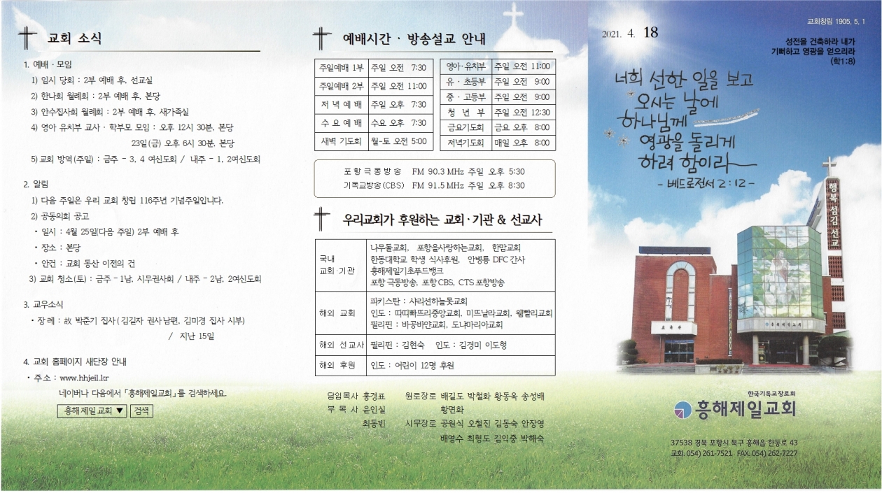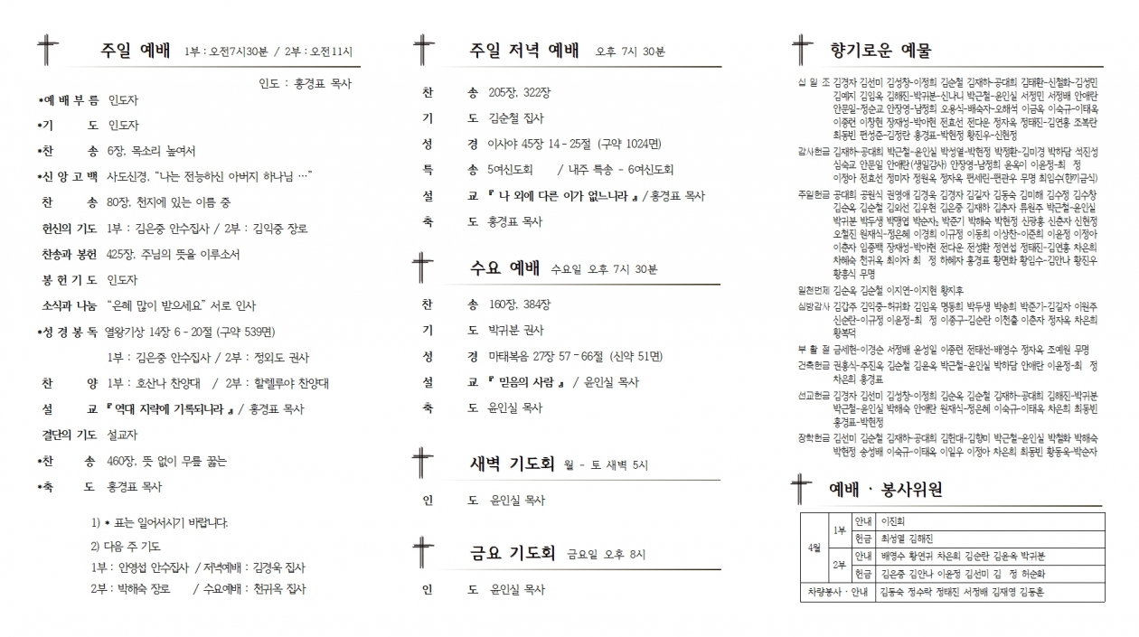 1. ¿¹¹è ¡¤ ¸ðÀÓ 1) Àӽà ´çȸ : 2ºÎ ¿¹¹è ÈÄ, ¼±±³½Ç 2) ÇѳªÈ¸ ¿ù·Êȸ : 2ºÎ ¿¹¹è ÈÄ, º»´ç 3) ¾È¼öÁý»çȸ ¿ù·Êȸ : 2ºÎ ¿¹¹è ÈÄ, »õ°¡Á·½Ç 4) ¿µ¾Æ À¯Ä¡ºÎ ±³»ç¡¤Çкθð ¸ðÀÓ : ¿ÀÈÄ 12½Ã 30ºÐ, º»´ç 23ÀÏ(±Ý) ¿ÀÈÄ 6½Ã 30ºÐ, º»´ç 5)±³È¸ ¹æ¿ª(ÁÖÀÏ) : ±ÝÁÖ – 3, 4 ¿©½ÅµµÈ¸ / ³»ÁÖ – 1, 2¿©½ÅµµÈ¸ 2. ¾Ë¸² 1) ´ÙÀ½ ÁÖÀÏÀº ¿ì¸® ±³È¸ ⸳ 116Áֳ⠱â³äÁÖÀÏÀÔ´Ï´Ù. 2) °øµ¿ÀÇȸ °ø°í • ÀϽà : 4¿ù 25ÀÏ(´ÙÀ½ ÁÖÀÏ) 2ºÎ ¿¹¹è ÈÄ • Àå¼Ò : º»´ç • ¾È°Ç : ±³È¸ µ¿»ê ÀÌÀüÀÇ °Ç 3) ±³È¸ û¼Ò(Åä) : ±ÝÁÖ– 1³², ½Ã¹«±Ç»çȸ / ³»ÁÖ– 2³², 2¿©½ÅµµÈ¸ 3. ±³¿ì¼Ò½Ä • Àå·Ê : ͺ ¹ÚÁرâ Áý»ç(±è±æÀÚ ±Ç»ç³²Æí, ±è¹Ì°æ Áý»ç ½ÃºÎ) / Áö³ 15ÀÏ 4. ±³È¸ ȨÆäÀÌÁö »õ´ÜÀå ¾È³» • ÁÖ¼Ò : www.hhjeil.kr ³×À̹ö³ª ´ÙÀ½¿¡¼ ¡¸ÈïÇØÁ¦Àϱ³È¸¡¹¸¦ °Ë»öÇϼ¼¿ä.