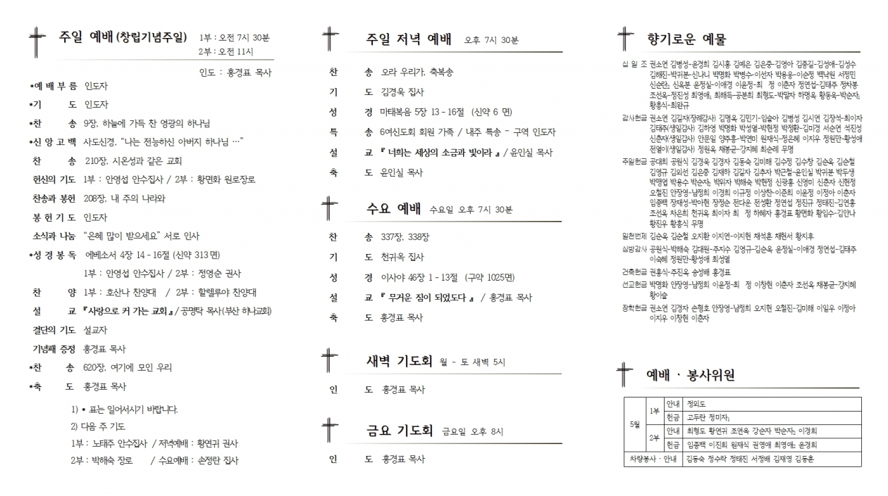 2) °øµ¿ÀÇȸ : 2ºÎ ¿¹¹è ÈÄ, º»´ç / ¾È°Ç : ±³È¸ µ¿»ê ÀÌÀüÀÇ °Ç 3) Á¤±â´çȸ : °øµ¿ÀÇȸ ÈÄ, ¼±±³½Ç 4) ÀºÅð±Ç»çȸ : °øµ¿ÀÇȸ ÈÄ, º»´ç 5) ¿µ¾Æ À¯Ä¡ºÎ ±³»ç¡¤Çкθð ¸ðÀÓ : ¿ÀÈÄ 5½Ã, º»´ç 30ÀÏ(±Ý) ¿ÀÈÄ 6½Ã30ºÐ, º»´ç 6)±³È¸ ¹æ¿ª(ÁÖÀÏ) : ±ÝÁÖ – 1, 2¿©½ÅµµÈ¸ / ³»ÁÖ – 1, 2³²½ÅµµÈ¸ 2. À¯¾Æ¼¼·Ê ¾È³» (ÀÚ°Ý : ºÎ¡¤¸ð ¸ðµÎ ¼¼·Ê ¹ÞÀº °¡Á¤) • ºÎ¸ð ¼¼·Ê ¹®´ä : 5¿ù 2ÀÏ ¿ÀÀü 10½Ã, ´çȸ½Ç • ¼¼·ÊÀÏ : 5¿ù 16ÀÏ 3. ¾Ë¸² 1) ´ë½É¹æ ¾È³» : ±³È¸ Ãâ¹ß, ¿ÀÀü 10½Ã • 27ÀÏ(È) : ´ÞÀü±¸¿ª •29ÀÏ(¸ñ) : Æ÷Ç×2±¸¿ª • 30ÀÏ(±Ý) : 2±³±¸ Ãß°¡½É¹æ 2) ³ª´® °£½Ä : ͺ °øº´¼º ¿ø·ÎÀå·Î À¯°¡Á· 3) °´ë»ó ²É²ÈÀÌ : °ø¿ø½Ä Àå·Î ¡¤ ¹ÚÇØ¼÷ Àå·Î(ȸ»ç »ç¹«½Ç ±â°ø °¨»ç) 4) ±³È¸ û¼Ò(Åä) : ±ÝÁÖ– 2³², 2¿©½ÅµµÈ¸/ ³»ÁÖ– ¾È¼öÁý»çȸ, 3¿© 4. ±³¿ì¼Ò½Ä • ÀÔ ´ë : ¾Èº´Ã¶ û³â, ±èÀ±¼ û³â/ 26ÀÏ(¿ù) • ÀÔ ¿ø : ±è±Ý¼ø Áý»ç / ¼¼¸í±âµ¶º´¿ø