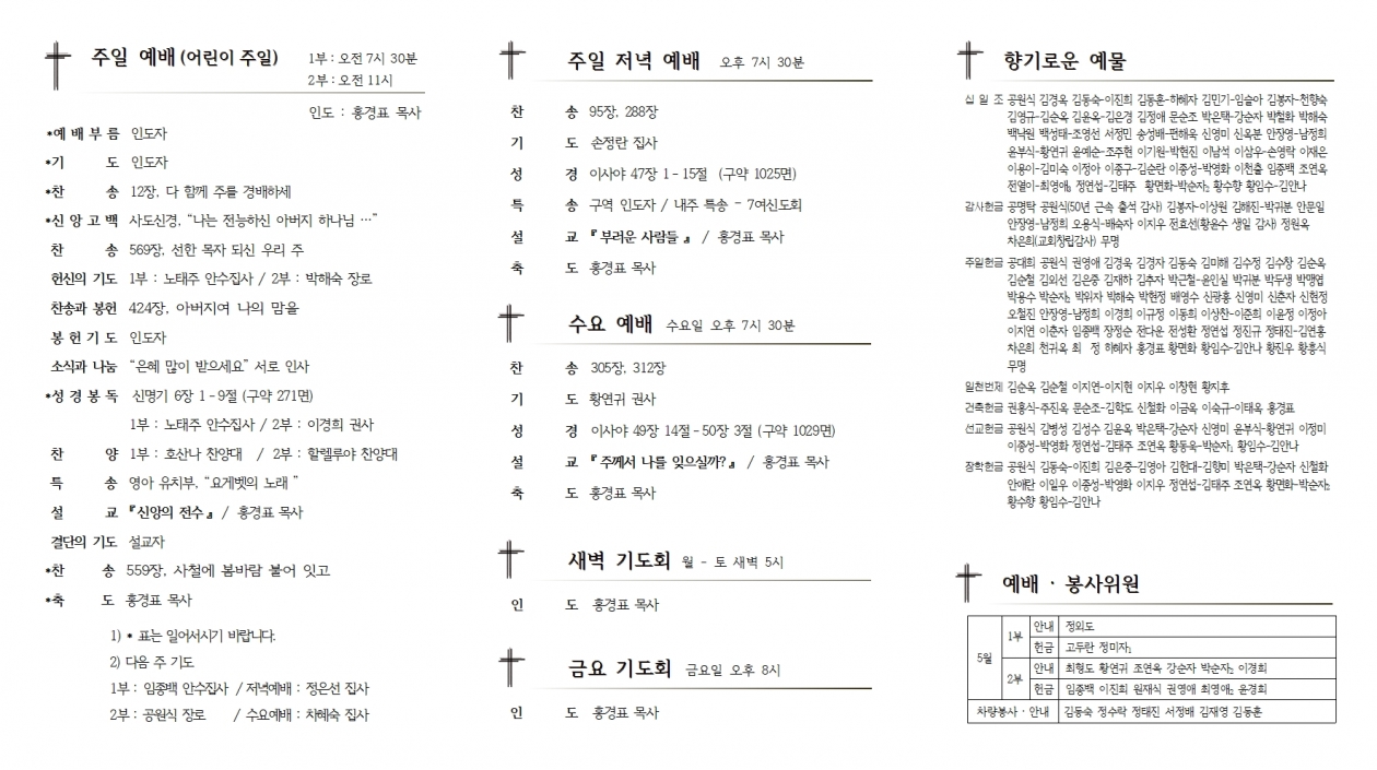 1. ¿¹¹è ¡¤ ¸ðÀÓ 1) ¾î¸°ÀÌ ÁÖÀÏ : ¿À´ÃÀº ¾î¸°ÀÌ ÁÖÀÏÀÔ´Ï´Ù. ´ÙÀ½ ¼¼´ëµéÀÌ ½Å¾Ó ¾È¿¡¼ Àß ¾çÀ°µÇµµ·Ï ±âµµÇϽñ⠹ٶø´Ï´Ù. 2) Á¤±â Á¦Á÷ȸ : 2ºÎ ¿¹¹è ÈÄ, º»´ç 3) ¹Ù¿ïȸ ¿ù·Êȸ : 2ºÎ ¿¹¹è ÈÄ, »õ°¡Á·½Ç 4) ±³È¸ ¹æ¿ª(ÁÖÀÏ) : ±ÝÁÖ – 1, 2³²½ÅµµÈ¸ / ³»ÁÖ – 3³², 7¿©½ÅµµÈ¸ 2. ¾Ë¸² 1) À¯¾Æ¼¼·Ê ¾È³» (ÀÚ°Ý : ºÎ¡¤¸ð ¸ðµÎ ¼¼·Ê ¹ÞÀº °¡Á¤) • ºÎ¸ð ¼¼·Ê ¹®´ä : ¿À´Ã ¿ÀÀü 10½Ã 30ºÐ, ´çȸ½Ç • ¼¼·ÊÀÏ : 5¿ù 16ÀÏ(¼Â°ÁÖÀÏ) 2) ÀÓ ¸í : õ±Í¿Á Áý»ç / È£»ê³ª Âù¾ç´ë¿ø 3) ±³È¸ û¼Ò(Åä) : ±ÝÁÖ–¾È¼öÁý»çȸ, 3¿© / ³»ÁÖ– 1³², 4¿©½ÅµµÈ¸ 3. 5¿ù ¸ñȸ ÀÏÁ¤ 2ÀÏ : ¾î¸°ÀÌÁÖÀÏ, Á¤±â Á¦Á÷ȸ, ¹Ù¿ïȸ ¿ù·Êȸ 9ÀÏ : ¾î¹öÀÌÁÖÀÏ, ³²¡¤ ¿©½ÅµµÈ¸ ¿ù·Êȸ, ±³À°À§¿øÈ¸ 16ÀÏ : ÇѳªÈ¸ ¿ù·Êȸ, ¾È¼öÁý»çȸ ¿ù·Êȸ 23ÀÏ : Âù¾ç´ë Çå½Å¿¹¹è, ±Ç»çȸ ¿ù·Êȸ 30ÀÏ : Á¤±â ´çȸ < ¿Â¶óÀÎ Çå±Ý > 1) »õ¸¶À»±Ý°í 5228-09-001078-7 ÈïÇØÁ¦Àϱ³È¸ £ª¿¹½Ã : È«±æµ¿½ÊÀÏÁ¶, È«±æµ¿ÁÖÀÏ, È«±æµ¿°¨»ç, È«±æµ¿¼±±³,µî 2) »õ¸¶À»±Ý°í 9002-1882-8280-0 ÈïÇØÁ¦Àϱ³È¸ / °ÇÃàÇå±Ý°èÁ £ª¿¹½Ã : È«±æµ¿°ÇÃà