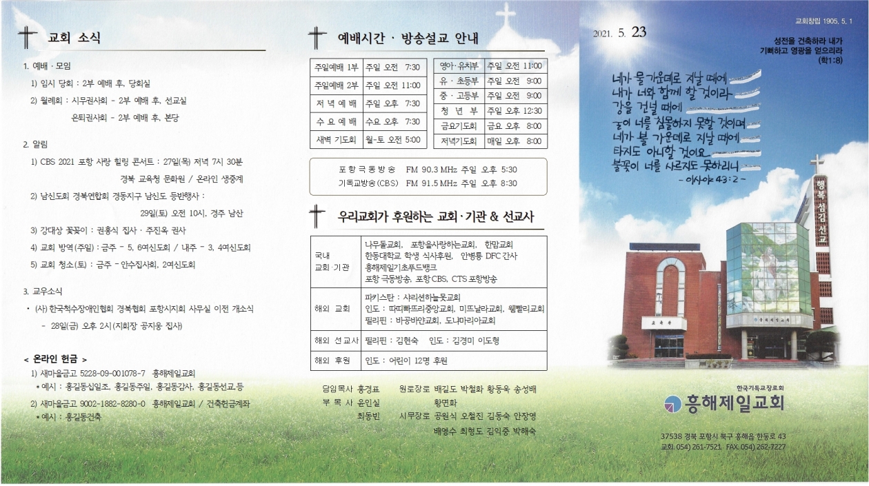 1. ¿¹¹è ¡¤ ¸ðÀÓ 1) Àӽà ´çȸ : 2ºÎ ¿¹¹è ÈÄ, ´çȸ½Ç 2) ¿ù·Êȸ : ½Ã¹«±Ç»çȸ - 2ºÎ ¿¹¹è ÈÄ, ¼±±³½Ç ÀºÅð±Ç»çȸ - 2ºÎ ¿¹¹è ÈÄ, º»´ç 2. ¾Ë¸² 1) CBS 2021 Æ÷Ç× »ç¶û Èú¸µ ÄܼƮ : 27ÀÏ(¸ñ) Àú³á 7½Ã 30ºÐ °æºÏ ±³À°Ã» ¹®È¿ø / ¿Â¶óÀÎ »ýÁß°è 2) ³²½ÅµµÈ¸ °æºÏ¿¬ÇÕȸ °æµ¿Áö±¸ ³²½Åµµ µî¹ÝÇà»ç : 29ÀÏ(Åä) ¿ÀÀü 10½Ã, °æÁÖ ³²»ê 3) °´ë»ó ²É²ÈÀÌ : ±ÇÈ«½Ä Áý»ç ¡¤ ÁÖÁø¿Á ±Ç»ç 4) ±³È¸ ¹æ¿ª(ÁÖÀÏ) : ±ÝÁÖ – 5, 6¿©½ÅµµÈ¸ / ³»ÁÖ – 3, 4¿©½ÅµµÈ¸ 5) ±³È¸ û¼Ò(Åä) : ±ÝÁÖ–¾È¼öÁý»çȸ, 2¿©½ÅµµÈ¸ 3. ±³¿ì¼Ò½Ä • (»ç)Çѱ¹Ã´¼öÀå¾ÖÀÎÇùȸ °æºÏÇùȸ Æ÷Ç×½ÃÁöȸ »ç¹«½Ç ÀÌÀü °³¼Ò½Ä - 28ÀÏ(±Ý) ¿ÀÈÄ 2½Ã(ÁöȸÀå °øÁö¿õ Áý»ç) < ¿Â¶óÀÎ Çå±Ý > 1) »õ¸¶À»±Ý°í 5228-09-001078-7 ÈïÇØÁ¦Àϱ³È¸ £ª¿¹½Ã : È«±æµ¿½ÊÀÏÁ¶, È«±æµ¿ÁÖÀÏ, È«±æµ¿°¨»ç, È«±æµ¿¼±±³,µî 2) »õ¸¶À»±Ý°í 9002-1882-8280-0 ÈïÇØÁ¦Àϱ³È¸ / °ÇÃàÇå±Ý°èÁ £ª¿¹½Ã : È«±æµ¿°ÇÃà