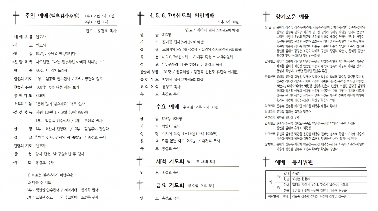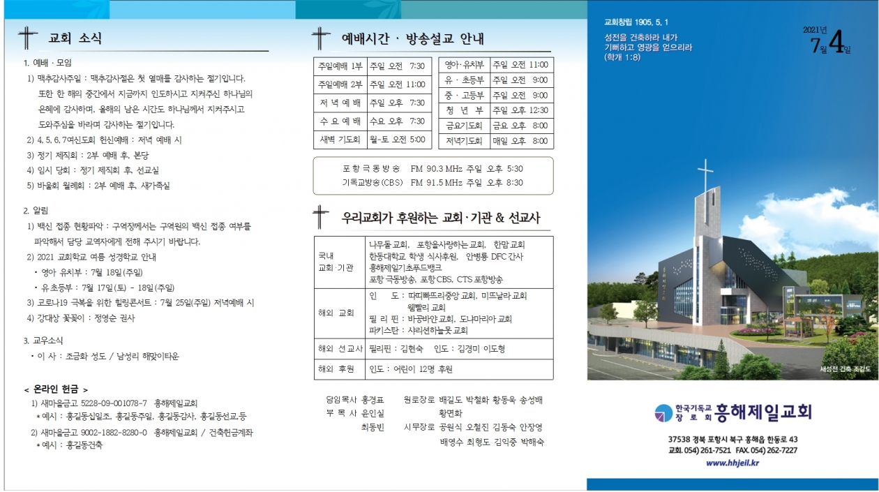 1. ¿¹¹è ¡¤ ¸ðÀÓ 1) ¸ÆÃß°¨»çÁÖÀÏ : ¸ÆÃß°¨»çÀýÀº ù ¿¸Å¸¦ °¨»çÇÏ´Â Àý±âÀÔ´Ï´Ù. ¶ÇÇÑ ÇÑ ÇØÀÇ Áß°£¿¡¼ Áö±Ý±îÁö ÀεµÇϽðí ÁöÄÑÁֽŠÇϳª´ÔÀÇ ÀºÇý¿¡ °¨»çÇϸç, ¿ÃÇØÀÇ ³²Àº ½Ã°£µµ Çϳª´Ô²²¼ ÁöÄÑÁÖ½Ã°í µµ¿ÍÁÖ½ÉÀ» ¹Ù¶ó¸ç °¨»çÇÏ´Â Àý±âÀÔ´Ï´Ù. 2) 4,5,6,7¿©½ÅµµÈ¸ Çå½Å¿¹¹è : Àú³á ¿¹¹è ½Ã 3) Á¤±â Á¦Á÷ȸ : 2ºÎ ¿¹¹è ÈÄ, º»´ç 4) Àӽà ´çȸ : Á¤±â Á¦Á÷ȸ ÈÄ, ¼±±³½Ç 5) ¹Ù¿ïȸ ¿ù·Êȸ : 2ºÎ ¿¹¹è ÈÄ, »õ°¡Á·½Ç 2. ¾Ë¸² 1) ¹é½Å Á¢Á¾ ÇöȲÆÄ¾Ç : ±¸¿ªÀå²²¼´Â ±¸¿ª¿øÀÇ ¹é½Å Á¢Á¾ ¿©ºÎ¸¦ ÆÄ¾ÇÇØ¼ ´ã´ç ±³¿ªÀÚ¿¡°Ô ÀüÇØ Áֽñ⠹ٶø´Ï´Ù. 2) 2021 ±³È¸Çб³ ¿©¸§ ¼º°æÇб³ ¾È³» • ¿µ¾Æ À¯Ä¡ºÎ : 7¿ù 18ÀÏ(ÁÖÀÏ) • À¯ÃʵîºÎ : 7¿ù 17ÀÏ(Åä) - 18ÀÏ(ÁÖÀÏ) 3) Äڷγª19 ±Øº¹À» À§ÇÑ Èú¸µÄܼƮ : 7¿ù 25ÀÏ(ÁÖÀÏ) Àú³á¿¹¹è ½Ã 4) °´ë»ó ²É²ÈÀÌ : Á¤¿µ¼ø ±Ç»ç 3. ±³¿ì¼Ò½Ä • ÀÌ »ç : Á¶±ÝÈ ¼ºµµ / ³²¼º¸® ÇØ¸ÂÀÌŸ¿î < ¿Â¶óÀÎ Çå±Ý > 1) »õ¸¶À»±Ý°í 5228-09-001078-7 ÈïÇØÁ¦Àϱ³È¸ £ª¿¹½Ã : È«±æµ¿½ÊÀÏÁ¶, È«±æµ¿ÁÖÀÏ, È«±æµ¿°¨»ç, È«±æµ¿¼±±³,µî 2) »õ¸¶À»±Ý°í 9002-1882-8280-0 ÈïÇØÁ¦Àϱ³È¸ / °ÇÃàÇå±Ý°èÁ £ª¿¹½Ã : È«±æµ¿°ÇÃà