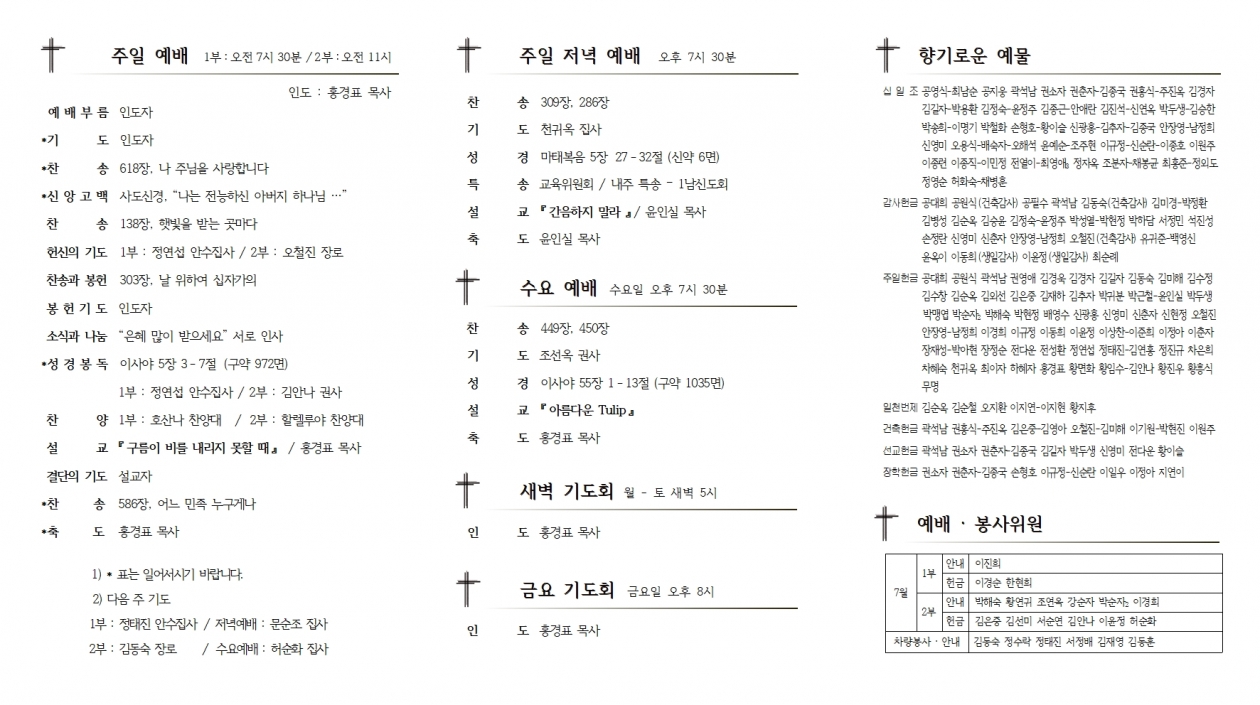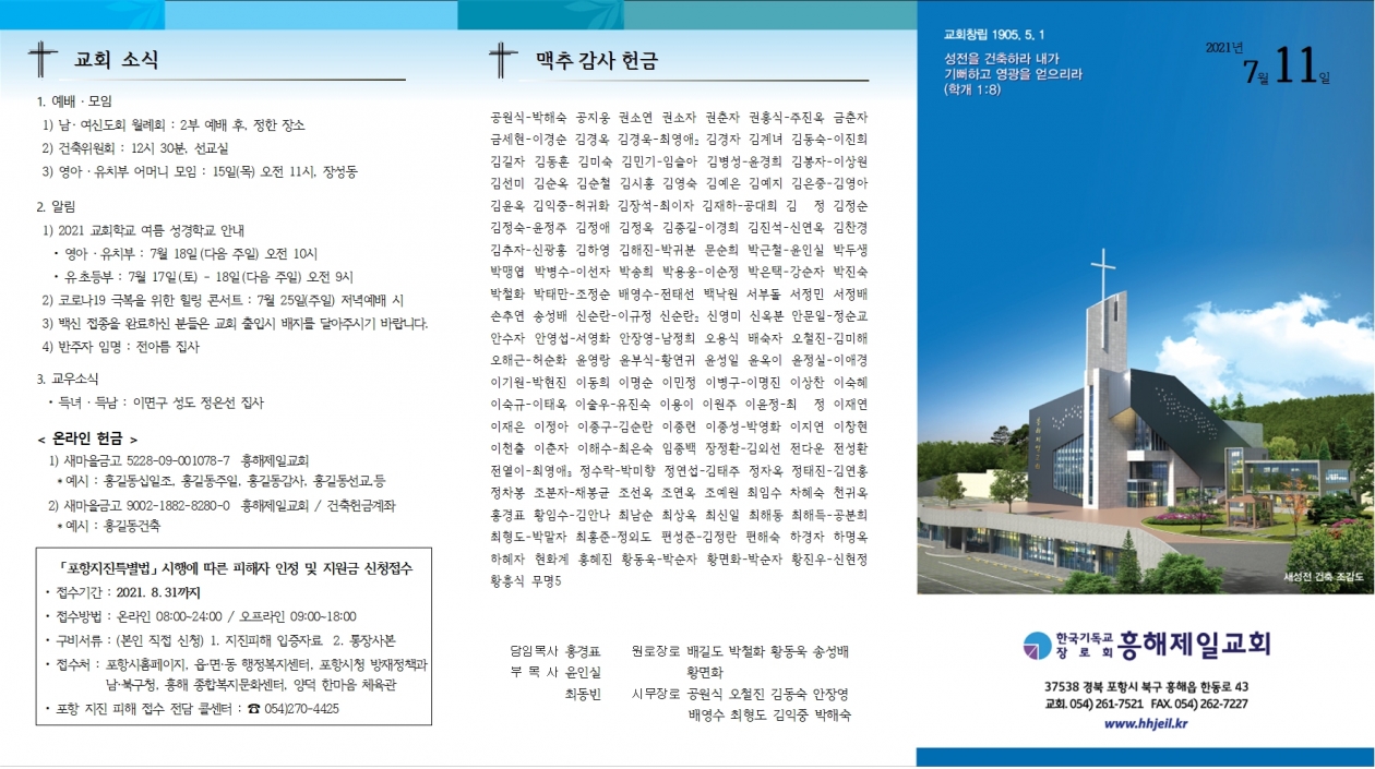 1. ¿¹¹è ¡¤ ¸ðÀÓ 1) ³²¡¤ ¿©½ÅµµÈ¸ ¿ù·Êȸ : 2ºÎ ¿¹¹è ÈÄ, Á¤ÇÑ Àå¼Ò 2) °ÇÃàÀ§¿øÈ¸ : 12½Ã 30ºÐ, ¼±±³½Ç 3) ¿µ¾Æ ¡¤ À¯Ä¡ºÎ ¾î¸Ó´Ï ¸ðÀÓ : 15ÀÏ(¸ñ) ¿ÀÀü 11½Ã, À强µ¿ 2. ¾Ë¸² 1) 2021 ±³È¸Çб³ ¿©¸§ ¼º°æÇб³ ¾È³» • ¿µ¾Æ ¡¤ À¯Ä¡ºÎ : 7¿ù 18ÀÏ(´ÙÀ½ ÁÖÀÏ) ¿ÀÀü 10½Ã • À¯ÃʵîºÎ : 7¿ù 17ÀÏ(Åä) - 18ÀÏ(´ÙÀ½ ÁÖÀÏ) ¿ÀÀü 9½Ã 2) Äڷγª19 ±Øº¹À» À§ÇÑ Èú¸µ ÄܼƮ : 7¿ù 25ÀÏ(ÁÖÀÏ) Àú³á¿¹¹è ½Ã 3) ¹é½Å Á¢Á¾À» ¿Ï·áÇϽŠºÐµéÀº ±³È¸ ÃâÀԽà ¹èÁö¸¦ ´Þ¾ÆÁֽñ⠹ٶø´Ï´Ù. 4) ¹ÝÁÖÀÚ ÀÓ¸í : Àü¾Æ¸§ Áý»ç 3. ±³¿ì¼Ò½Ä • µæ³à ¡¤ µæ³² : À̸鱸 ¼ºµµ Á¤Àº¼± Áý»ç < ¿Â¶óÀÎ Çå±Ý > 1) »õ¸¶À»±Ý°í 5228-09-001078-7 ÈïÇØÁ¦Àϱ³È¸ £ª¿¹½Ã : È«±æµ¿½ÊÀÏÁ¶, È«±æµ¿ÁÖÀÏ, È«±æµ¿°¨»ç, È«±æµ¿¼±±³,µî 2) »õ¸¶À»±Ý°í 9002-1882-8280-0 ÈïÇØÁ¦Àϱ³È¸ / °ÇÃàÇå±Ý°èÁ £ª¿¹½Ã : È«±æµ¿°ÇÃà