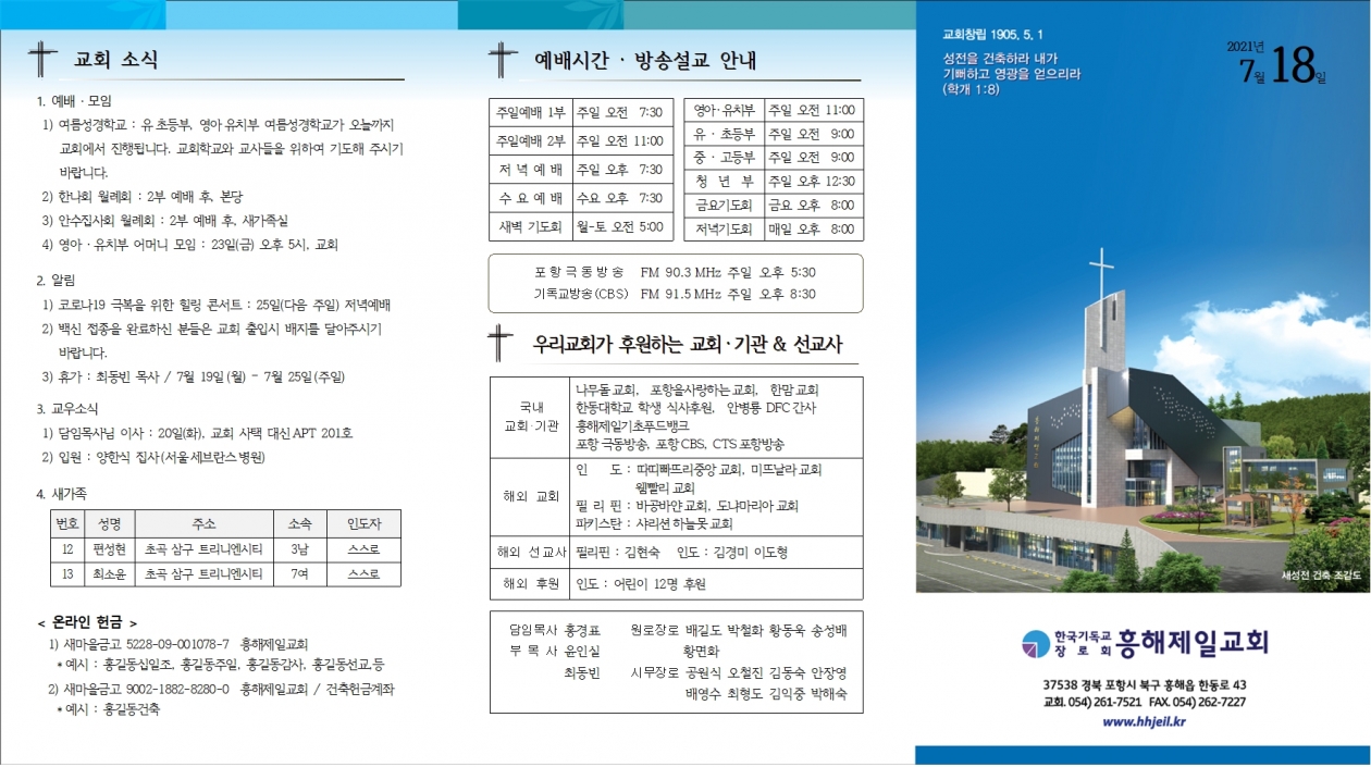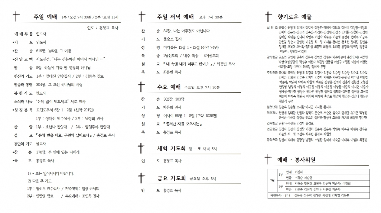1. ¿¹¹è ¡¤ ¸ðÀÓ 1) ¿©¸§¼º°æÇб³ : À¯ÃʵîºÎ, ¿µ¾ÆÀ¯Ä¡ºÎ ¿©¸§¼º°æÇб³°¡ ¿À´Ã±îÁö ±³È¸¿¡¼ ÁøÇàµË´Ï´Ù. ±³È¸Çб³¿Í ±³»çµéÀ» À§ÇÏ¿© ±âµµÇØ Áֽñ⠹ٶø´Ï´Ù. 2) ÇѳªÈ¸ ¿ù·Êȸ : 2ºÎ ¿¹¹è ÈÄ, º»´ç 3) ¾È¼öÁý»çȸ ¿ù·Êȸ : 2ºÎ ¿¹¹è ÈÄ, »õ°¡Á·½Ç 4) ¿µ¾Æ ¡¤ À¯Ä¡ºÎ ¾î¸Ó´Ï ¸ðÀÓ : 23ÀÏ(±Ý) ¿ÀÈÄ 5½Ã, ±³È¸ 2. ¾Ë¸² 1) Äڷγª19 ±Øº¹À» À§ÇÑ Èú¸µ ÄܼƮ : 25ÀÏ(´ÙÀ½ ÁÖÀÏ) Àú³á¿¹¹è 2) ¹é½Å Á¢Á¾À» ¿Ï·áÇϽŠºÐµéÀº ±³È¸ ÃâÀԽà ¹èÁö¸¦ ´Þ¾ÆÁֽñ⠹ٶø´Ï´Ù. 3) ÈÞ°¡ : ÃÖµ¿ºó ¸ñ»ç / 7¿ù 19ÀÏ(¿ù) – 7¿ù 25ÀÏ(ÁÖÀÏ) 3. ±³¿ì¼Ò½Ä 1) ´ãÀÓ¸ñ»ç´Ô ÀÌ»ç : 20ÀÏ(È), ±³È¸ »çÅà ´ë½ÅAPT 201È£ 2) ÀÔ¿ø : ¾çÇÑ½Ä Áý»ç(¼¿ï¼¼ºê¶õ½ºº´¿ø) 4. »õ°¡Á· ¹øÈ£ | ¼º¸í | ÁÖ¼Ò | ¼Ò¼Ó | ÀεµÀÚ | 12 | Æí¼ºÇö | ÃÊ°î »ï±¸ Æ®¸®´Ï¿£½ÃƼ | 3³² | ½º½º·Î | 13 | ÃÖ¼ÒÀ± | ÃÊ°î »ï±¸ Æ®¸®´Ï¿£½ÃƼ | 7¿© | ½º½º·Î |