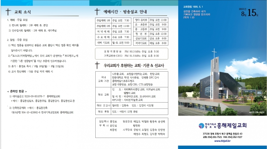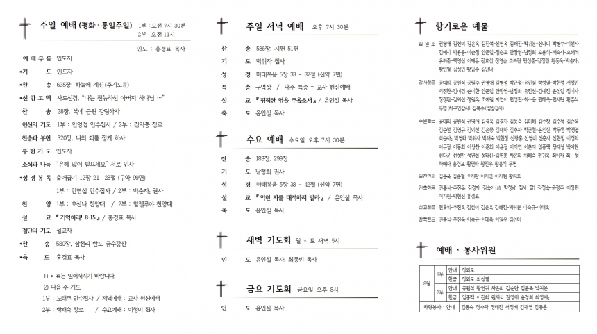 1. ¿¹¹è ¡¤ ÁÖÀÏ ¸ðÀÓ 1) ÇѳªÈ¸ ¿ù·Êȸ : 2ºÎ ¿¹¹è ÈÄ, º»´ç 2) ¾È¼öÁý»çȸ ¿ù·Êȸ : 2ºÎ ¿¹¹è ÈÄ, »õ°¡Á·½Ç 2. ¾Ë¸² ¡¤ ÁÖÁß ¸ðÀÓ 1) ¹é½Å Á¢Á¾À» ¿Ï·áÇϽŠºÐµéÀº ±³È¸ ÃâÀԽà ¹é½Å Á¢Á¾ È®ÀÎ ¹èÁö¸¦ ´Þ¾ÆÁֽñ⠹ٶø´Ï´Ù. 2) ¡ºÆ÷½ºÄÚ(Áö¿ªÇù·ÂÆÀ)¡»¿¡¼ ¿ì¸® ±³È¸°¡ ¿î¿µÇÏ´Â ¡ºÇªµå¹ðÅ©¡»¿¡ ±âÁõÇÑ ¡°1Åæ ³Ãµ¿Å¾Â÷¡±¸¦ Áö³ ÁÖÁß¿¡ ÀμöÇÏ¿´½À´Ï´Ù. 3) ÈÞ°¡ : È«°æÇ¥ ¸ñ»ç / 8¿ù 16ÀÏ(¿ù) – 8¿ù 21ÀÏ(Åä) 4) ±³»ç Çå½Å¿¹¹è : ´ÙÀ½ ÁÖÀÏ Àú³á ¿¹¹è ½Ã