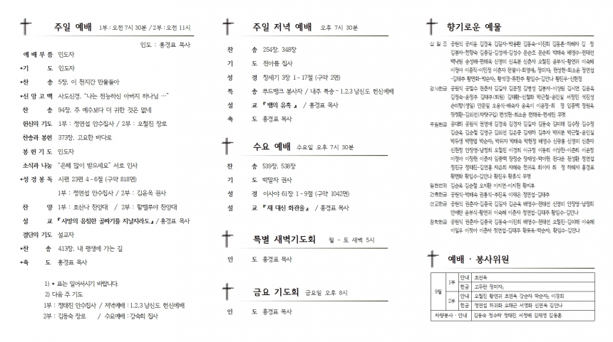 1. ¿¹¹è ¡¤ ÁÖÀÏ ¸ðÀÓ 1) Á¤±â Á¦Á÷ȸ : 2ºÎ ¿¹¹è ÈÄ, º»´ç 2) ¹Ù¿ïȸ : 2ºÎ ¿¹¹è ÈÄ, »õ°¡Á·½Ç 2. »õ ¼ºÀü °ÇÃàÀ» À§ÇÑ Á¦3Â÷ Ưº°±âµµÈ¸ - Ưº° »õº® ±âµµÈ¸: 9¿ù 18ÀÏ(Åä)±îÁö. »õº®5½Ã, º»´ç - 24½Ã°£ ¸±·¹ÀÌ ±âµµÈ¸ : 9¿ù 30ÀÏ(¸ñ)±îÁö, 1Ãþ ¼±±³½Ç (¿¹»ç¶û ¾Õ °Ô½ÃµÈ ¸±·¹ÀÌ ±âµµÇ¥¿¡ °¡´ÉÇϽŠ½Ã°£À» Àû¾î ÁÖ¼¼¿ä.) 3. ¾Ë¸² ¡¤ ÁÖÁß ¸ðÀÓ 1) ¹é½Å 1,2Â÷ Á¢Á¾À» ÇϽŠºÐµéÀº ±³È¸ ¼¹« ¶Ç´Â ¸ñ»ç´Ô¿¡°Ô ¿¬¶ô (Á¢¼ö)ÇÏ¿© Áֽñ⠹ٶø´Ï´Ù. 2) °æºÏ³ëȸ Á¦142ȸ 2Â÷ Àӽóëȸ : 9¿ù 7ÀÏ(È) ¿ÀÈÄ 2½Ã ÇູÀÌ ³ÑÄ¡´Â ±³È¸´ç (±¸¹Ì½Ã µµºÀ·Î5¾È±æ 7-36) 3) 1,2,3³²½ÅµµÈ¸ Çå½Å¿¹¹è : ´ÙÀ½ ÁÖÀÏ Àú³á ¿¹¹è ½Ã 4) ³ª´® °£½Ä : ÃÖµ¿ºó ¸ñ»ç °¡Á¤(°áÈ¥ °¨»ç) ¡Ý Ưº° »õº®±âµµÈ¸ ±âµµ ¼ø¼ÀÚ ¡Ý 9/6(¿ù) | 9/7(È) | 9/8(¼ö) | 9/9(¸ñ) | 9/10(±Ý) | 9/11(Åä) | ¹è¿µ¼ö Àå·Î | ¹ÚÇØ¼÷ Àå·Î | ¹Ú±ÍºÐ±Ç»ç (¿¬ÇÕ¿©È¸Àå) | ȲÁø¿ì ¾È¼öÁý»ç | ±èÀºÁß ¾È¼öÁý»ç | Á¤¿¬¼· ¾È¼öÁý»ç | 9/13(¿ù) | 9/14(È) | 9/15(¼ö) | 9/16(¸ñ) | 9/17(±Ý) | 9/18(Åä) | ³ëÅÂÁÖ ¾È¼öÁý»ç | ÀÓÁ¾¹é ¾È¼öÁý»ç | Á¤ÅÂÁø ¾È¼öÁý»ç | ¼Û¼º¹è ¿ø·ÎÀå·Î | ±èÀÍÁß Àå·Î | û³âºÎ |