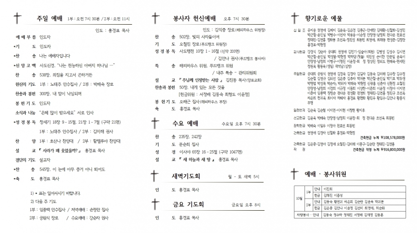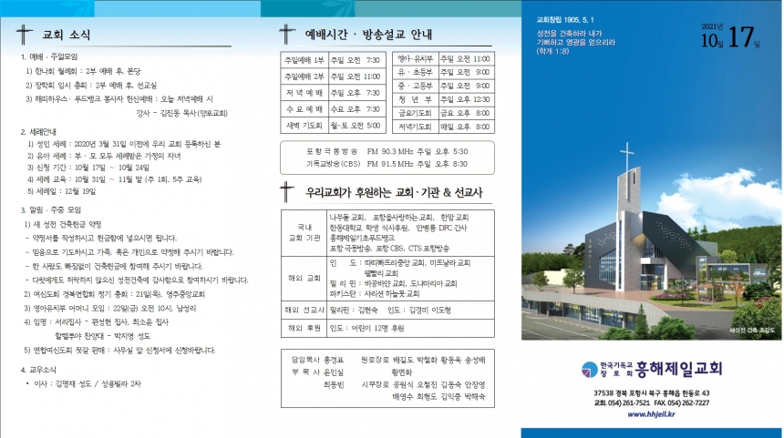 1. ¿¹¹è ¡¤ ÁÖÀϸðÀÓ 1) ÇѳªÈ¸ ¿ù·Êȸ : 2ºÎ ¿¹¹è ÈÄ, º»´ç 2) ÀåÇÐȸ Àӽà ÃÑȸ : 2ºÎ ¿¹¹è ÈÄ, ¼±±³½Ç 3) ÇØÇÇÇϿ콺¡¤ Ǫµå¹ðÅ© ºÀ»çÀÚ Çå½Å¿¹¹è : ¿À´Ã Àú³á¿¹¹è ½Ã °»ç – ±èÁøµ¿ ¸ñ»ç(¾çÆ÷±³È¸) 2. ¼¼·Ê¾È³» 1) ¼ºÀÎ ¼¼·Ê : 2020³â 3¿ù 31ÀÏ ÀÌÀü¿¡ ¿ì¸® ±³È¸ µî·ÏÇϽŠºÐ 2) À¯¾Æ ¼¼·Ê : ºÎ ¡¤ ¸ð ¸ðµÎ ¼¼·Ê¹ÞÀº °¡Á¤ÀÇ ÀÚ³à 3) ½Åû ±â°£ : 10¿ù 17ÀÏ ¡ 10¿ù 24ÀÏ 4) ¼¼·Ê ±³À° : 10¿ù 31ÀÏ ¡ 11¿ù ¸» (ÁÖ 1ȸ, 5ÁÖ ±³À°) 5) ¼¼·ÊÀÏ : 12¿ù 19ÀÏ 3. ¾Ë¸² ¡¤ ÁÖÁß ¸ðÀÓ 1) »õ ¼ºÀü °ÇÃàÇå±Ý ¾àÁ¤ - ¾àÁ¤¼¸¦ ÀÛ¼ºÇϽðí Çå±ÝÇÔ¿¡ ³ÖÀ¸½Ã¸é µË´Ï´Ù. - ¹ÏÀ½À¸·Î ±âµµÇÏ½Ã°í °¡Á·, ȤÀº °³ÀÎÀ¸·Î ¾àÁ¤ÇØ Áֽñ⠹ٶø´Ï´Ù. - ÇÑ »ç¶÷µµ ºüÁü¾øÀÌ °ÇÃàÇå±Ý¿¡ Âü¿©ÇØ Áֽñ⠹ٶø´Ï´Ù. - ´ÙÀ¿¡°Ôµµ Çã¶ôÇÏÁö ¾ÊÀ¸½Å ¼ºÀü°ÇÃà¿¡ °¨»çÇÔÀ¸·Î Âü¿©ÇϽñ⠹ٶø´Ï´Ù. 2) ¿©½ÅµµÈ¸ °æºÏ¿¬ÇÕȸ Á¤±â ÃÑȸ : 21ÀÏ(¸ñ), ¿µÁÖÁß¾Ó±³È¸ 3) ¿µ¾ÆÀ¯Ä¡ºÎ ¾î¸Ó´Ï ¸ðÀÓ : 22ÀÏ(±Ý) ¿ÀÀü 10½Ã, ³²¼º¸® 4) ÀÓ¸í : ¼¸®Áý»ç – Æí¼ºÇö Áý»ç, ÃÖ¼ÒÀ± Áý»ç ÇÒ·¼·ç¾ß Âù¾ç´ë – ¹ÚÁö¿µ ¼ºµµ 5) ¿¬ÇÕ¿©½ÅµµÈ¸ Á£°¥ ÆÇ¸Å : »ç¹«½Ç ¾Õ ½Åû¼¿¡ ½Åû¹Ù¶ø´Ï´Ù. 4. ±³¿ì¼Ò½Ä ⦁ ÀÌ»ç : ±è¸íÀç ¼ºµµ / »ó¿ëºô¶ó 2Â÷