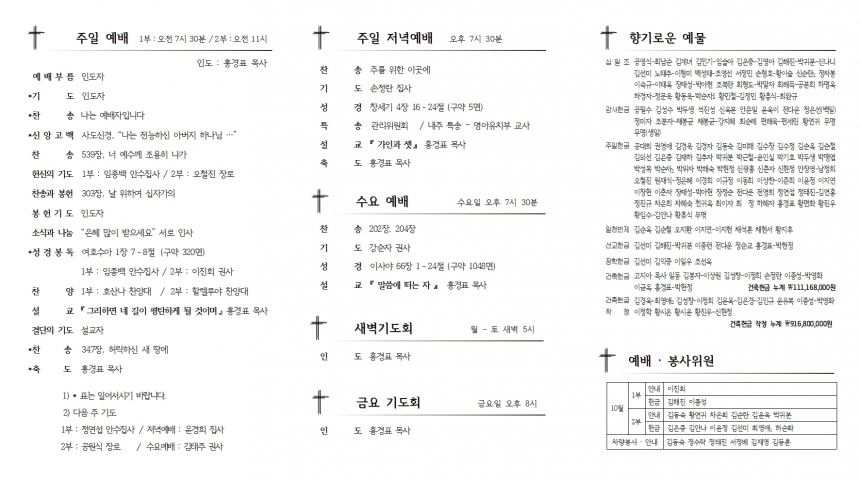 1. ¿¹¹è ¡¤ ÁÖÀϸðÀÓ 1) Àӽà ´çȸ : 2ºÎ ¿¹¹è ÈÄ, ´çȸ½Ç 2) ½Ã¹«±Ç»çȸ ¿ù·Êȸ : 2ºÎ ¿¹¹è ÈÄ, ¼±±³½Ç 3) ÀºÅð±Ç»çȸ ¿ù·Êȸ : 2ºÎ ¿¹¹è ÈÄ, º»´ç 2. ¼¼·Ê¾È³» 1) ¼ºÀÎ ¼¼·Ê : 2020³â 3¿ù 31ÀÏ ÀÌÀü¿¡ ¿ì¸® ±³È¸ µî·ÏÇϽŠºÐ 2) À¯¾Æ ¼¼·Ê : ºÎ ¡¤ ¸ð ¸ðµÎ ¼¼·Ê¹ÞÀº °¡Á¤ÀÇ ÀÚ³à 3) ½Åû ±â°£ : 10¿ù 17ÀÏ ¡ 10¿ù 24ÀÏ 4) ¼¼·Ê ±³À° : 10¿ù 31ÀÏ ¡ 11¿ù ¸» (ÁÖ 1ȸ, 5ÁÖ ±³À°) 5) ¼¼·ÊÀÏ : 12¿ù 19ÀÏ 3. »õ ¼ºÀü °ÇÃàÇå±Ý ¾àÁ¤ - ¾àÁ¤¼¸¦ ÀÛ¼ºÇϽðí Çå±ÝÇÔ¿¡ ³ÖÀ¸½Ã¸é µË´Ï´Ù. - ¹ÏÀ½À¸·Î ±âµµÇÏ½Ã°í °¡Á·, ȤÀº °³ÀÎÀ¸·Î ¾àÁ¤ÇØ Áֽñ⠹ٶø´Ï´Ù. - ÇÑ »ç¶÷µµ ºüÁü¾øÀÌ °ÇÃàÇå±Ý¿¡ Âü¿©ÇØ Áֽñ⠹ٶø´Ï´Ù. - ´ÙÀ¿¡°Ôµµ Çã¶ôÇÏÁö ¾ÊÀ¸½Å ¼ºÀü°ÇÃà¿¡ °¨»çÇÔÀ¸·Î Âü¿©ÇϽñ⠹ٶø´Ï´Ù. 4. ¾Ë¸² ¡¤ ÁÖÁß ¸ðÀÓ 1) ÇѳªÈ¸ Ä£±³¸ðÀÓ : 28ÀÏ(¸ñ) ¿ÀÀü 8½Ã 30ºÐ, ±³È¸Áý°á 2) ¿µ¾ÆÀ¯Ä¡ºÎ ¾î¸Ó´Ï ¸ðÀÓ : 29ÀÏ(±Ý) ¿ÀÀü 11½Ã, ¿¹»ç¶û 5. ¿¬ÇÕȸ, ÀÌ¿ô±³È¸ 1) Æ÷Çױ⵶±³ ±³È¸¿¬ÇÕȸ Á¤±âÃÑȸ : 28ÀÏ(¸ñ), ¿ÀÀü 11½Ã, Æ÷Ç׿¤¸²±³È¸ 2) ºÏÁö±³È¸ ´ãÀÓ¸ñ»ç ÃëÀÓ½Ä : ¹è¿µÈ£ ¸ñ»ç, 31ÀÏ(ÁÖÀÏ) ¿ÀÈÄ 4½Ã 30ºÐ 3) °æÁÖ ¼¶ó¹ú±³È¸ Àå·Î¡¤±Ç»ç¡¤¾È¼öÁý»ç ÀÓÁ÷ ¹× ÀºÅð ¹× Ãߴ뿹¹è - 10¿ù 30ÀÏ(Åä) ¿ÀÈÄ 2½Ã, °æÁÖ ¼¶ó¹ú±³È¸´ç - Àå·Î ÀºÅð ¹× ¿ø·Î Àå·Î Ãß´ë : ±èÄ¡Çö - ½Ã¹«Àå·Î ÀÓÁ÷ : ±è±æÈ£, ±èöÀº