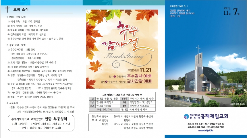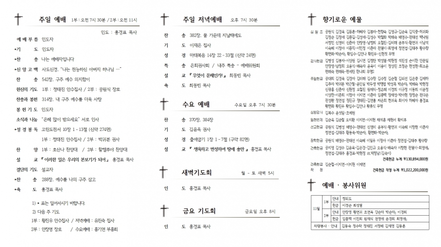 1. ¿¹¹è ¡¤ ÁÖÀÏ ¸ðÀÓ 1) ¼¼·Ê ±³À° : ¿ÀÀü 10½Ã, ´çȸ½Ç 2) Á¤±â Á¦Á÷ȸ : 2ºÎ ¿¹¹è ÈÄ, º»´ç 3) ¹Ù¿ïȸ ¿ù·Êȸ : 2ºÎ ¿¹¹è ÈÄ, »õ°¡Á·½Ç 4) °ÇÃàÀ§¿øÈ¸ ¸ðÀÓ : Á¦Á÷ȸ ÈÄ, ¼±±³½Ç 5) Ãß¼ö°¨»çÀý °¨»ç Âù¾ç ¿¹¹è Áغñ ¸ðÀÓ : ¿ÀÈÄ 2½Ã, º»´ç 2. ÁÖÁß ¸ðÀÓ ¡¤ ¾Ë¸² 1) Ãß¼ö°¨»çÁÖÀÏ : 11¿ù 21ÀÏ • 2ºÎ ¿¹¹è ÈÄ¿¡ °øµ¿½Ä»ç¸¦ Á¦°øÇÕ´Ï´Ù. • °¨»çÂù¾ç¿¹¹è – ¿ÀÈÄ 1½Ã 30ºÐ 2) ±³È¸ ½Ä´ç ´ëû¼Ò : 14ÀÏ(´ÙÀ½ÁÖÀÏ) 2ºÎ ¿¹¹è ÈÄ 3) »õ ¼ºÀü °ÇÃàÇå±Ý ¾àÁ¤ : 11¿ù 30ÀϱîÁö 4) ÀºÅð±Ç»çȸ Ä£±³¸ðÀÓ : 9ÀÏ(È), ¿ïÁø (±³È¸ Ãâ¹ß ¿ÀÀü 8½Ã 30ºÐ) 5) ÀÓ¸í : ÇÒ·¼·ç¾ß Âù¾ç´ë¿ø – ÀåÀ缺 ¼ºµµ, ¹Ú¾ÆÇö ¼ºµµ °ÇÃàÀ§¿ø – ȲÁø¿ì ¾È¼öÁý»ç / ¹ÝÁÖ – ÃÖ¼ÒÀ± Áý»ç 6) ¼ö´É ¹× Áø·Î¸¦ À§ÇÑ ±âµµ : Áß3, °í3 ÇлýµéÀ» À§ÇÏ¿© ±âµµÇսôÙ. • Áß3 : ·ù¼º¹Î ÇԽ¸ñ • °í3 : ±è¹Î¼ À¯ÁöÇö Àü¿ìÁÖ Á¤È£Á¤ 7) ³ª´® °£½Ä : ±èâȯ ¼ºµµ¡¤ÀÌÀ翬 Áý»ç(ÀÚ³à µ¹ °¨»ç) 8) Çå¹° : ÀÌÁ¤¾Æ Áý»ç(¼Õ ¼Òµ¶Á¦ 3¹Ú½º, 150°³) 3. ±³¿ì¼Ò½Ä • °áÈ¥ : ±è¿ì°ï ¼ºµµ¡¤ÀÌÁ¤¾Æ Áý»ç ¾Æµé ±è¼º¿î(±º) 13ÀÏ(Åä) ³· 12½Ã Æ÷Ç× ¼¹ÔÄÁº¥¼Ç(¼ÒƼÀç·Î 151¹ø±æ 5), ±³È¸Ãâ¹ß 11½Ã 20ºÐ