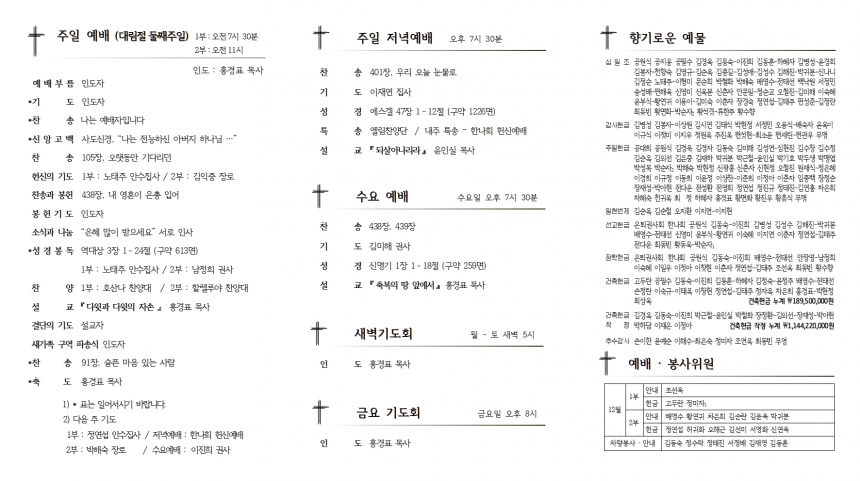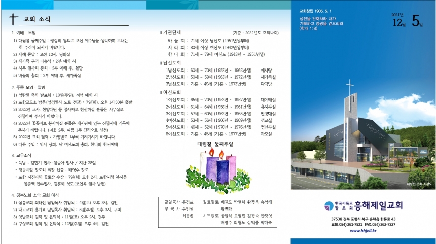 1. ¿¹¹è ¡¤ ¸ðÀÓ 1) ´ë¸²Àý µÑ°ÁÖÀÏ : Æò°ÀÇ ¿ÕÀ¸·Î ¿À½Å ¿¹¼ö´ÔÀ» »ý°¢ÇÏ¸ç º¸³»´Â ÇÑ ÁÖ°£ÀÌ µÇ½Ã±â ¹Ù¶ø´Ï´Ù. 2) ¼¼·Ê ¹®´ä : ¿ÀÀü 10½Ã, ´çȸ½Ç 3) »õ°¡Á· ±¸¿ª ÆÄ¼Û½Ä : 2ºÎ ¿¹¹è ½Ã 4) ½Ã¹« ±Ç»çȸ ÃÑȸ : 2ºÎ ¿¹¹è ÈÄ, º»´ç 5) ¹Ù¿ïȸ ÃÑȸ : 2ºÎ ¿¹¹è ÈÄ, »õ°¡Á·½Ç 2. ÁÖÁß ¸ðÀÓ ¡¤ ¾Ë¸² 1) ¼ºÅºÀý ÃàÇÏ ¹ßǥȸ : 19ÀÏ(ÁÖÀÏ), Àú³á ¿¹¹è ½Ã 2) Æ÷Ç×±³µµ¼Ò ¹æ¹®(¼º°æÇÊ»ç ³ëÆ® Àü´Þ) : 7ÀÏ(È), ¿ÀÈÄ1½Ã30ºÐ Ãâ¹ß 3) 2022³â ±³»ç, Âù¾ç´ë¿ø µî ºÀ»çÀÚ·Î Çå½ÅÇÏ½Ç ºÐµéÀº »ç¹«½Ç·Î ½ÅûÇÏ¿© Áֽñ⠹ٶø´Ï´Ù. 4) 2022³â ²É²ÈÀÌ·Î ºÀ»çÇÏ½Ç ºÐµéÀº °Ô½ÃÆÇ¿¡ ÀÖ´Â ½Åû¼¿¡ ±â·ÏÇØ Áֽñ⠹ٶø´Ï´Ù. (°Ü¿ï 2ÁÖ, ¿©¸§ 1ÁÖ °£°ÝÀ¸·Î ½Åû) 5) 2022³â ±³È¸ ´Þ·Â : °¡Á¤º°·Î 1ºÎ¾¿ °¡Á®°¡½Ã±â ¹Ù¶ø´Ï´Ù. 6) ´ÙÀ½ ÁÖÀÏ : Àӽà ´çȸ, ³² ¿©½ÅµµÈ¸ ÃÑȸ, ÇѳªÈ¸ Çå½Å¿¹¹è 3. ±³¿ì¼Ò½Ä • µæ³² : ±è¹Î±â Áý»ç¡¤ÀÓ½½¾Æ Áý»ç / Áö³ 28ÀÏ • °æµ¿½ÃÂû Àå·Îȸ ȸÀå ¼±Ãâ : ¹è¿µ¼ö Àå·Î • Æ÷Ç× ÁöÁøÇÇÇØ °ø·Î»ó ¼ö»ó : 7ÀÏ(È) ¿ÀÈÄ 2½Ã, Æ÷Ç×½Ãû º¹Áöµ¿ - ÀÓÁ¾¹é ¾È¼öÁý»ç, ±èÈ«Á¦ ¼ºµµ(Á¶¿¬¿Á ±Ç»ç ³²Æí) 4. °æºÏ³ëȸ ¼Ò¼Ó ±³È¸ ¿¹½Ä 1) »ïºÀ±³È¸ ÃÖÅÂÁø ´ãÀÓ¸ñ»ç ÃëÀÓ½Ä : 4ÀÏ(Åä) ¿ÀÈÄ 3½Ã, ±èõ 2) ³»°í±³È¸ È«±âÇ¥ ´ãÀÓ¸ñ»ç ÃëÀÓ½Ä : 5ÀÏ(ÁÖÀÏ) ¿ÀÈÄ 3½Ã, ±¸¹Ì 3) ¾ç³²±³È¸ ÀÓÁ÷ ¹× ÀºÅð½Ä : 11ÀÏ(Åä) ¿ÀÈÄ 2½Ã, °æÁÖ 4) ±¸¼º±³È¸ ÀÓÁ÷ ¹× ÀºÅð½Ä : 12ÀÏ(ÁÖÀÏ) ¿ÀÈÄ 4½Ã, ±èõ