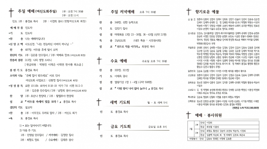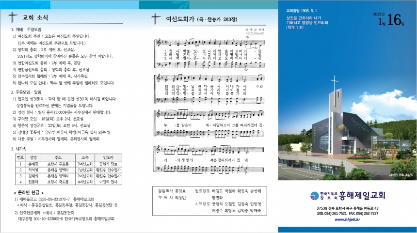 1. ¿¹¹è ¡¤ ÁÖÀϸðÀÓ 1) ¿©½ÅµµÈ¸ ÁÖÀÏ : ¿À´ÃÀº ¿©½ÅµµÈ¸ ÁÖÀÏÀÔ´Ï´Ù. (2ºÎ ¿¹¹è´Â ¿©½ÅµµÈ¸ ÁÖ°üÀ¸·Î µå¸³´Ï´Ù.) 2) ÀåÇÐȸ ÃÑȸ : 2ºÎ ¿¹¹è ÈÄ, ¼±±³½Ç. 2021³âµµ ÀåÇÐȸºñ¿¡ Âü¿©ÇϽŠºÐµéÀº ¸ðµÎ Âü¼® ¹Ù¶ø´Ï´Ù. 3) ¿¬ÇÕ¿©½ÅµµÈ¸ ÃÑȸ : 2ºÎ ¿¹¹è ÈÄ, º»´ç 4) ¿¬ÇÕ³²½ÅµµÈ¸ ÃÑȸ : ÀåÇÐȸ ÃÑȸ ÈÄ, ¼±±³½Ç 5) ¾È¼öÁý»çȸ ¿ù·Êȸ : 2ºÎ ¿¹¹è ÈÄ, »õ°¡Á·½Ç 6) ÇѳªÈ¸ ¸ðÀÓ ¾È³» : ¦¼ö ¿ù ¼Â° ÁÖÀÏ¿¡ ¿ù·Êȸ·Î ¸ðÀÔ´Ï´Ù. 2. ÁÖÁ߸ðÀÓ ¡¤ ¾Ë¸² 1) Àü±³ÀÎ ¼º°æÅëµ¶ : °¢ÀÚ ÇÑ ÇØ µ¿¾È ¼º°æ1µ¶ ÇÏ½Ã±æ ¹Ù¶ø´Ï´Ù. ¼º°æÅëµ¶À» ¿Ï·áÇϽŠºÐ²²´Â ±â³äǰÀ» µå¸³´Ï´Ù. 2) ¼º°æ ÇÊ»ç : ÇÊ»ç ¿ëÁö(3,000¿ø)´Â »ç¹«½Ç¿¡¼ ÆÇ¸ÅÇÕ´Ï´Ù. 3) ±¸¿ªÀå ¸ðÀÓ : 18ÀÏ(È) ¿ÀÈÄ 2½Ã, ¼±±³½Ç 4) Ç×Á¸Á÷ ¼º°æ°øºÎ : 22ÀÏ(Åä) ¿ÀÀü 6½Ã, ¼±±³½Ç 5) °´ë»ó ²É²ÈÀÌ : À¯³âºÎ ÀÌÀ¯Áö Çлý(À̱ݿÁ Áý»ç ¿Ü¼Õ³à) 6) ´ÙÀ½ ÁÖÀÏ : ½Ã¹«±Ç»çȸ ¿ù·Êȸ, ÀºÅð±Ç»çȸ ¿ù·Êȸ 3. »õ°¡Á· ¹øÈ£ | ¼º¸í | ÁÖ¼Ò | ¼Ò¼Ó | ÀεµÀÚ | 1 | È«ÇýÁø | Æ÷Ç׽à µÎÈ£µ¿ | 5¿©½ÅµµÈ¸ | °ø¿ø½Ä Àå·Î | 2 | Çã¼®¿ | ÈïÇØÀ¾ ¾ç¹é¸® | 1³²½ÅµµÈ¸ | ȲÁø¿ì ¾È¼öÁý»ç | 3 | ±èÅÂÈñ | ÈïÇØÀ¾ ¾ç¹é¸® | 2¿©½ÅµµÈ¸ | ȲÁø¿ì ¾È¼öÁý»ç | 4 | Áøµ¿È | Æ÷Ç׽à Á×µµµ¿ | 4¿©½ÅµµÈ¸ | À̰æÈñ ±Ç»ç |
