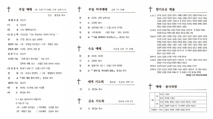 1. ¿¹¹è ¡¤ ÁÖÀϸðÀÓ 1) ÀåÇÐȸ ÇöȲº¸°í : ±³È¸¿Í Áö¿ª»çȸÀÇ ÀÎÀç¾ç¼ºÀ» À§Çؼ ÀåÇÐ Çå±ÝÀ» µå¸®´Â ÀÏ¿¡ Âü¿©ÇØ Áֽбâ°ü, ¼ºµµµé²² °¨»çµå¸³´Ï´Ù. ÀåÇÐȸ¸¦ À§Çؼ ´õ¿í ±âµµÇØ Áֽñ⠹ٶø´Ï´Ù. 2) ½Ã¹«±Ç»çȸ ¿ù·Êȸ : 2ºÎ ¿¹¹è ÈÄ, ¼±±³½Ç 3) ÀºÅð±Ç»çȸ ¿ù·Êȸ : 2ºÎ ¿¹¹è ÈÄ, º»´ç 4) ±³»ç ±³À° : ¿ÀÈÄ 1½Ã, ¼±±³½Ç. °»ç – À̼ºÈ£ ¸ñ»ç(Æ÷Ç×À» »ç¶ûÇÏ´Â ±³È¸) 2. ÁÖÁ߸ðÀÓ ¡¤ ¾Ë¸² 1) Àü±³ÀÎ ¼º°æÅëµ¶ : °¢ÀÚ ÇÑÇØ µ¿¾È ¼º°æ1µ¶ ÇÏ½Ã±æ ¹Ù¶ø´Ï´Ù. ¼º°æÅëµ¶À» ¿Ï·áÇϽŠºÐ²²´Â ±â³äǰÀ» µå¸³´Ï´Ù. 2) ¼º°æ ÇÊ»ç : ÇÊ»ç ¿ëÁö(3,000¿ø)´Â »ç¹«½Ç¿¡¼ ÆÇ¸ÅÇÕ´Ï´Ù. 3) ±¸¿ªÀå ¸ðÀÓ : 25ÀÏ(È) ¿ÀÈÄ 2½Ã, ¼±±³½Ç 4) Ç×Á¸Á÷ ¼º°æ°øºÎ : 29ÀÏ(Åä) ¿ÀÀü 6½Ã, ¼±±³½Ç 5) ±³È¸»ýȰ¿ä¶÷ : 2022³â ±³È¸»ýȰ¿ä¶÷ÀÌ ¹ß°£µÇ¾ú½À´Ï´Ù. ÁÖº¸ÇÔ¿¡¼ ã¾Æ°¡½Ã°í, °á¼®ÀÚ´Â ±¸¿ªÀå²²¼ ½É¹æÇϽðí ÀüÇØÁÖ½Ã±æ ¹Ù¶ø´Ï´Ù. 6) ´ÙÀ½ ÁÖÀÏ : Á¤±â´çȸ 3. ³ëȸ ¡¤ ¿¬ÇÕȸ ⦁ °æµ¿½ÃÂûÀ§¿øÈ¸ : 25ÀÏ(È) ¿ÀÈÄ 4½Ã, ¿ì¸® ±³È¸ 4. ±³¿ì¼Ò½Ä ⦁ ÀÔ¿ø : ¼Á¤¹è Áý»ç(Æ÷Ç׿츮º´¿ø) < ¿Â¶óÀÎ Çå±Ý > 1) »õ¸¶À»±Ý°í 5228-09-001078-7 ÈïÇØÁ¦Àϱ³È¸ £ª¿¹½Ã : È«±æµ¿½ÊÀÏÁ¶, È«±æµ¿ÁÖÀÏ, È«±æµ¿°¨»ç, È«±æµ¿¼ºÅº µî 2) °ÇÃàÇå±Ý°èÁ £ª¿¹½Ã : È«±æµ¿°ÇÃà ´ë±¸ÀºÇà 504-10-423662-6 Çѱ¹±âµ¶±³Àå·Îȸ ÈïÇØÁ¦Àϱ³È¸