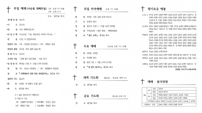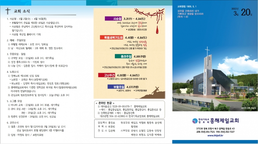 1. »ç¼øÀý : 3¿ù 2ÀÏ(¼ö) ¡ 4¿ù 16ÀÏ(Åä) ⦁ºÎȰÀý±îÁö ÁÖÀÏÀ» Á¦¿ÜÇÑ 40ÀÏÀº »ç¼øÀýÀÔ´Ï´Ù. ⦁»ç¼øÀýÀº ÁÖ´Ô²²¼ °í³¹ÞÀ¸½Ã°í Á×À¸½ÉÀ» ¹¬»óÇÏ¸ç °¨»çÇÏ´Â Àý±âÀÔ´Ï´Ù. ⦁»ç¼øÀý ¹¬»óÁý ȨÆäÀÌÁö ±âÀç 2. ¿¹¹è ¡¤ ÁÖÀϸðÀÓ 1) ºÎȰÀý ¼¼·Ê±³À° : ¿ÀÀü 10½Ã, ´çȸ½Ç 2) ³² ¡¤ ¿©½ÅµµÈ¸ ¿ù·Êȸ : 2ºÎ ¿¹¹è ÈÄ, Á¤ÇÑ Àå¼Ò¿¡¼ 3. ÁÖÁ߸ðÀÓ ¡¤ ¾Ë¸² 1) ±¸¿ªÀå ¸ðÀÓ : 22ÀÏ(È) ¿ÀÈÄ 2½Ã, »õ°¡Á·½Ç 2) ¼º°æ Åëµ¶(2022-5) : ÀÌÁøÈñ ±Ç»ç 3) ³ª´® °£½Ä : ±èµ¿ÈÆ Áý»ç, ÇÏÇýÀÚ Áý»ç(Àå·Ê Áß À§·Î°¨»ç) 4. ³ëȸ¼Ò½Ä 1) °æºÏ³ëȸ Á¦143ȸ ½ÅÀÓ ÀÓ¿ø ⦁³ëȸÀå – ¿ÀÀç±Ô ¸ñ»ç(Æ÷Ç׿¹°¡±³È¸) ⦁ºÎ³ëȸÀå - ±èÁ¤¶ô ¸ñ»ç(»õ±æ±³È¸), Àü¼ºÈ£ Àå·Î(´ë¸í±³È¸) 2) ÈïÇØÁ¦Àϱ³È¸¿¡¼ ±âÁõÇÑ ÀåÇбÝÀº ÃÖ¼®¿ø ¸ñ»ç(¸»¾¸À§¿¡¼¼¿î±³È¸) Àڳ࿡°Ô Àü´ÞÇÏ¿´½À´Ï´Ù. 3) °ü½É±³È¸ ¿ø·ÎÀå·ÎÃß´ë ¹× ±Ç»çÀÓÁ÷ : ¿À´Ã(ÁÖÀÏ) ¿ÀÈÄ 3½Ã 5. ¼Ò±×·ì ¸ðÀÓ 1) ¹Ù³ª¹Ù ±³À° : 22ÀÏ(È) ¿ÀÈÄ 3½Ã 30ºÐ, »õ°¡Á·½Ç 2) ťƼ ¸ðÀÓ A¹Ý : 24ÀÏ(¸ñ) ¿ÀÈÄ 2½Ã, »õ°¡Á·½Ç B¹Ý : 25ÀÏ(±Ý) ¿ÀÈÄ 2½Ã, »õ°¡Á·½Ç 3) Ç×Á¸Á÷ ¼º°æ°øºÎ : 26ÀÏ(Åä) ¿ÀÀü 6½Ã, ¼±±³½Ç 6. ±³¿ì¼Ò½Ä 1) °áÈ¥ :Á¶¿¬¿Á ±Ç»ç µþ(±è¹Ì¸®³») 3¿ù 26ÀÏ(Åä) ³· 12½Ã ¼º³² ¹Ð¸®ÅäÇÇ¾Æ È£ÅÚ ¿þµù¼¾ÅÍ 3Ãþ Ä«¸á¸®¾ÆÈ¦ 2) ÀÔ¿ø :Çϸí¿Á ±Ç»ç / Æ÷Ç×ÀÇ·á¿ø