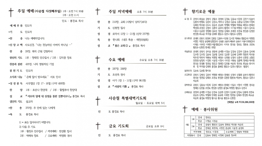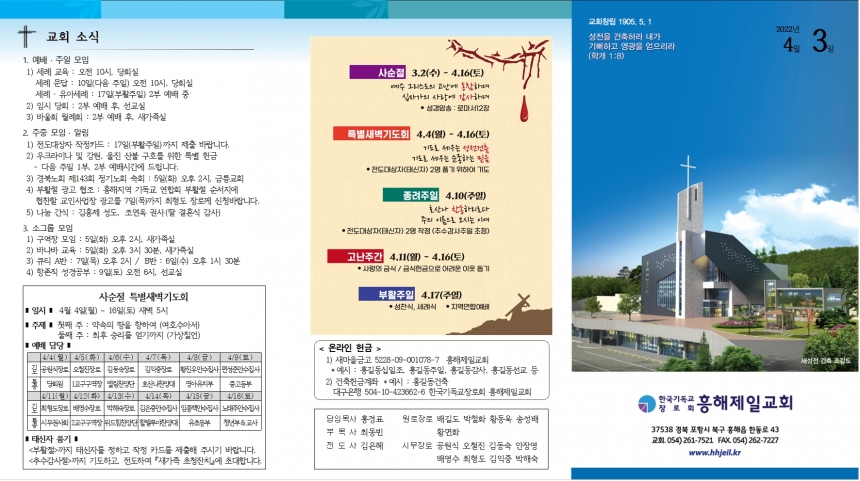 1. ¿¹¹è ¡¤ ÁÖÀÏ ¸ðÀÓ 1) ¼¼·Ê ±³À° : ¿ÀÀü 10½Ã, ´çȸ½Ç ¼¼·Ê ¹®´ä : 10ÀÏ(´ÙÀ½ ÁÖÀÏ) ¿ÀÀü 10½Ã, ´çȸ½Ç ¼¼·Ê ¡¤ À¯¾Æ¼¼·Ê : 17ÀÏ(ºÎȰÁÖÀÏ) 2ºÎ ¿¹¹è Áß 2) Àӽà ´çȸ : 2ºÎ ¿¹¹è ÈÄ, ¼±±³½Ç 3) ¹Ù¿ïȸ ¿ù·Êȸ : 2ºÎ ¿¹¹è ÈÄ, »õ°¡Á·½Ç 2. ÁÖÁß ¸ðÀÓ ¡¤ ¾Ë¸² 1) Àüµµ´ë»óÀÚ ÀÛÁ¤Ä«µå : 17ÀÏ(ºÎȰÁÖÀÏ)±îÁö Á¦Ãâ ¹Ù¶ø´Ï´Ù. 2) ¿ìÅ©¶óÀ̳ª ¹× °¿ø, ¿ïÁø »êºÒ ±¸È£¸¦ À§ÇÑ Æ¯º° Çå±Ý - ´ÙÀ½ ÁÖÀÏ 1ºÎ, 2ºÎ ¿¹¹è½Ã°£¿¡ µå¸³´Ï´Ù. 3) °æºÏ³ëȸ Á¦143ȸ Á¤±â³ëȸ ¼Óȸ : 5ÀÏ(È) ¿ÀÈÄ 2½Ã, ±Ý¸ª±³È¸ 4) ºÎȰÀý ±¤°í ÇùÁ¶ : ÈïÇØÁö¿ª ±âµ¶±³ ¿¬ÇÕȸ ºÎȰÀý ¼ø¼Áö¿¡ ÇùÂùÇÒ ±³Àλç¾÷Àå ±¤°í¸¦ 7ÀÏ(¸ñ)±îÁö ÃÖÇüµµ Àå·Î²² ½Åû¹Ù¶ø´Ï´Ù. 5) ³ª´® °£½Ä : ±èÈ«Á¦ ¼ºµµ, Á¶¿¬¿Á ±Ç»ç(µþ °áÈ¥½Ä °¨»ç) 3. ¼Ò±×·ì ¸ðÀÓ 1) ±¸¿ªÀå ¸ðÀÓ : 5ÀÏ(È) ¿ÀÈÄ 2½Ã, »õ°¡Á·½Ç 2) ¹Ù³ª¹Ù ±³À° : 5ÀÏ(È) ¿ÀÈÄ 3½Ã 30ºÐ, »õ°¡Á·½Ç 3) ťƼ A¹Ý : 7ÀÏ(¸ñ) ¿ÀÈÄ 2½Ã / B¹Ý : 6ÀÏ(¼ö) ¿ÀÈÄ 1½Ã 30ºÐ 4) Ç×Á¸Á÷ ¼º°æ°øºÎ : 9ÀÏ(Åä) ¿ÀÀü 6½Ã, ¼±±³½Ç