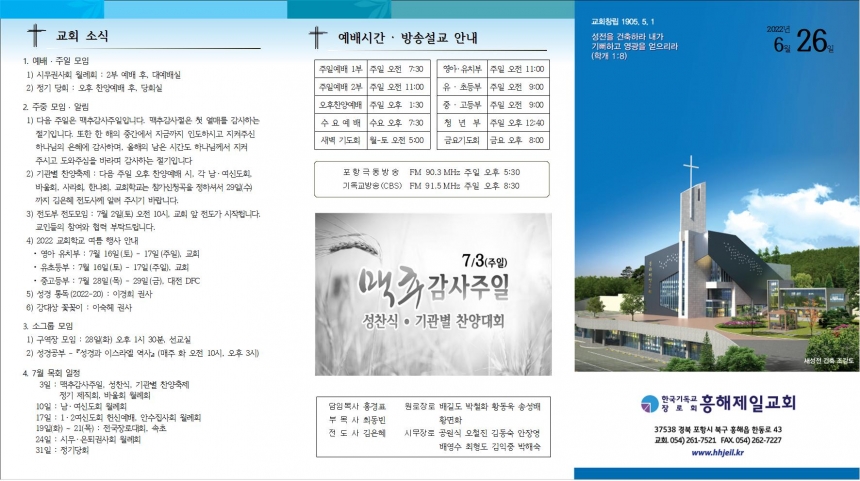 2. ÁÖÁß ¸ðÀÓ ¡¤ ¾Ë¸² 1) ´ÙÀ½ ÁÖÀÏÀº ¸ÆÃß°¨»çÁÖÀÏÀÔ´Ï´Ù. ¸ÆÃß°¨»çÀýÀº ù ¿¸Å¸¦ °¨»çÇÏ´Â Àý±âÀÔ´Ï´Ù. ¶ÇÇÑ ÇÑ ÇØÀÇ Áß°£¿¡¼ Áö±Ý±îÁö ÀεµÇϽðí ÁöÄÑÁֽŠÇϳª´ÔÀÇ ÀºÇý¿¡ °¨»çÇϸç, ¿ÃÇØÀÇ ³²Àº ½Ã°£µµ Çϳª´Ô²²¼ ÁöÄÑ ÁÖ½Ã°í µµ¿ÍÁÖ½ÉÀ» ¹Ù¶ó¸ç °¨»çÇÏ´Â Àý±âÀÔ´Ï´Ù 2) ±â°üº° Âù¾çÃàÁ¦ : ´ÙÀ½ ÁÖÀÏ ¿ÀÈÄ Âù¾ç¿¹¹è ½Ã, °¢ ³²¡¤¿©½ÅµµÈ¸, ¹Ù¿ïȸ, »ç¶óȸ, ÇѳªÈ¸, ±³È¸Çб³´Â Âü°¡½Åû°îÀ» Á¤Çϼż 29ÀÏ(¼ö)±îÁö ±èÀºÇý Àüµµ»ç²² ¾Ë·Á Áֽñ⠹ٶø´Ï´Ù. 3) ÀüµµºÎ Àüµµ¸ðÀÓ : 7¿ù 2ÀÏ(Åä) ¿ÀÀü 10½Ã, ±³È¸ ¾Õ Àüµµ°¡ ½ÃÀ۵˴ϴÙ. ±³ÀεéÀÇ Âü¿©¿Í Çù·Â ºÎʵ右´Ï´Ù. 4) 2022 ±³È¸Çб³ ¿©¸§ Çà»ç ¾È³» • ¿µ¾Æ À¯Ä¡ºÎ : 7¿ù 16ÀÏ(Åä) - 17ÀÏ(ÁÖÀÏ), ±³È¸ • À¯ÃʵîºÎ : 7¿ù 16ÀÏ(Åä) - 17ÀÏ(ÁÖÀÏ), ±³È¸ • Áß°íµîºÎ : 7¿ù 28ÀÏ(¸ñ) - 29ÀÏ(±Ý), ´ëÀü DFC 5) ¼º°æ Åëµ¶(2022-20) : À̰æÈñ ±Ç»ç 6) °´ë»ó ²É²ÈÀÌ : À̼÷Çý ±Ç»ç 3. ¼Ò±×·ì ¸ðÀÓ 1) ±¸¿ªÀå ¸ðÀÓ : 28ÀÏ(È) ¿ÀÈÄ 1½Ã 30ºÐ, ¼±±³½Ç 2) ¼º°æ°øºÎ - ¡º¼º°æ°ú À̽º¶ó¿¤ ¿ª»ç¡» (¸ÅÁÖ È ¿ÀÀü 10½Ã, ¿ÀÈÄ 3½Ã) 4. 7¿ù ¸ñȸ ÀÏÁ¤ 3ÀÏ : ¸ÆÃß°¨»çÁÖÀÏ, ¼ºÂù½Ä, ±â°üº° Âù¾çÃàÁ¦ Á¤±â Á¦Á÷ȸ, ¹Ù¿ïȸ ¿ù·Êȸ 10ÀÏ : ³²¡¤¿©½ÅµµÈ¸ ¿ù·Êȸ 17ÀÏ : 1¡¤2¿©½ÅµµÈ¸ Çå½Å¿¹¹è, ¾È¼öÁý»çȸ ¿ù·Êȸ 19ÀÏ(È) ~ 21(¸ñ) : Àü±¹Àå·Î´ëȸ, ¼ÓÃÊ 24ÀÏ : ½Ã¹«¡¤ÀºÅð±Ç»çȸ ¿ù·Êȸ 31ÀÏ : Á¤±â´çȸ