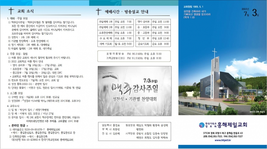 2. ÁÖÁß ¸ðÀÓ ¡¤ ¾Ë¸² 1) ¿©¸§ µ¿¾È ±³È¸ÀÇ ¿¡³ÊÁö Àý¾à¿¡ ÇùÁ¶ÇØ Áֽñ⠹ٶø´Ï´Ù. 2) 2022 ±³È¸Çб³ ¿©¸§ Çà»ç ¾È³» • ¿µ¾Æ À¯Ä¡ºÎ : 7¿ù 16ÀÏ(Åä) - 17ÀÏ(ÁÖÀÏ), ±³È¸ • À¯ÃʵîºÎ : 7¿ù 16ÀÏ(Åä) - 17ÀÏ(ÁÖÀÏ), ±³È¸ • Áß°íµîºÎ : 7¿ù 28ÀÏ(¸ñ) - 29ÀÏ(±Ý), ´ëÀü DFC £ª±³È¸Çб³ ¿©¸§ Çà»ç¸¦ À§Çؼ ¸¹Àº °ü½É°ú ±âµµ¿Í ÈÄ¿ø ºÎʵ右´Ï´Ù. 3) ÀüµµºÎ Àüµµ¸ðÀÓ : 7ÀÏ(¸ñ) ¿ÀÀü 10½Ã, ±³È¸ ¾Õ 4) ¼º°æ Åëµ¶(2022-21) : ¼Õ¿µ¶ô Áý»ç 5) °´ë»ó ²É²ÈÀÌ : À̸鱸 ¼ºµµ, Á¤Àº¼± Áý»ç(ÀÌ¿¹¿ø, ÀÌÁØ¿ø ù »ýÀÏ) 3. ¼Ò±×·ì ¸ðÀÓ 1) ±¸¿ªÀå ¸ðÀÓ : 5ÀÏ(È) ¿ÀÈÄ 12½Ã 30ºÐ, ¼±±³½Ç 2) ¼º°æ°øºÎ : ¡º¼º°æ°ú À̽º¶ó¿¤ ¿ª»ç¡» (¸ÅÁÖÈ¿ÀÀü 10½Ã30ºÐ, ¿ÀÈÄ3½Ã) 4. ±³¿ì¼Ò½Ä 1) ÀÔ ¿ø : ¹Ú»óÀÚ Áý»ç / ¼¼¸í±âµ¶º´¿ø 2) Àå ·Ê : À̺´¼® ¼ºµµ ¸ðÄ£»ó / Áö³ 27ÀÏ 3) °øÁö¿õ Áý»ç : Á¦ 2ȸ Æ÷Ç׽à ô¼öÀå¾ÖÀÎ ÇѸ¶À½ ÁõÁø´ëȸ, 6ÀÏ(¼ö) ¶ó¸Þ¸£¿þµùÄÁº¥¼Ç 6Ãþ ·çüȦ, ±³È¸Ãâ¹ß 10½Ã 30ºÐ