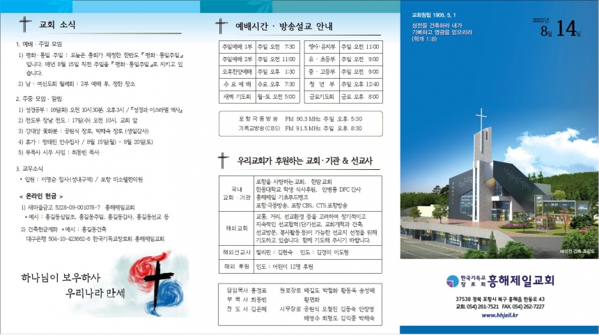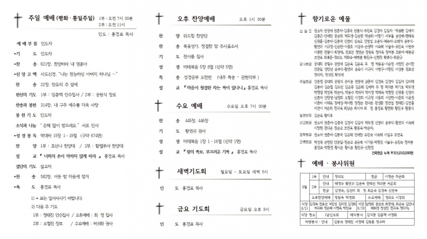 2. ÁÖÁß ¸ðÀÓ ¡¤ ¾Ë¸² 1) ¼º°æ°øºÎ : 16ÀÏ(È) ¿ÀÀü 10½Ã30ºÐ, ¿ÀÈÄ3½Ã / ¡º¼º°æ°ú À̽º¶ó¿¤ ¿ª»ç¡» 2) ÀüµµºÎ À峯 Àüµµ : 17ÀÏ(¼ö) ¿ÀÀü 10½Ã, ±³È¸ ¾Õ 3) °´ë»ó ²ÉȺР: °ø¿ø½Ä Àå·Î, ¹ÚÇØ¼÷ Àå·Î (»ýÀϰ¨»ç) 4) ÈÞ°¡ : Á¤ÅÂÁø ¾È¼öÁý»ç / 8¿ù 15ÀÏ(¿ù) - 8¿ù 20ÀÏ(Åä) 5) ºÎ¸ñ»ç ½Ã¹« »çÀÓ : ÃÖµ¿ºó ¸ñ»ç