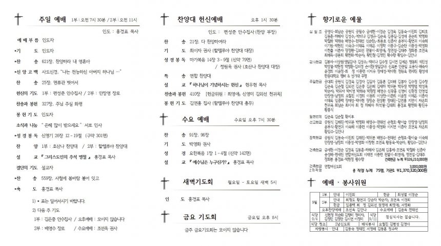 2. ÁÖÁß ¸ðÀÓ ¡¤ ¾Ë¸² 1) Ãß¼® ¸íÀý : À̹ø ÁÖ°£¿¡´Â Ãß¼® ¸íÀýÀÌ ÀÖ½À´Ï´Ù. ⦁ ÇѰ¡À§ °¡Á¤¿¹¹è ¼ø¼Áö°¡ ¾È³»¼®¿¡ ¸¶·ÃµÇ¾î ÀÖ½À´Ï´Ù. ⦁ ±ÝÁÖ ±Ý¿ä±âµµÈ¸(9ÀÏ)¿Í ´ÙÀ½ ÁÖÀÏ(11ÀÏ) ¿ÀÈÄ Âù¾ç¿¹¹è´Â ¸ðÀÌÁö ¾Ê½À´Ï´Ù.. ⦁ ´ÙÀ½ ÁÖÀÏ Á¡½É ½Ä»ç´Â Á¦°øÇÏÁö ¾Ê½À´Ï´Ù. 2) °æµ¿½ÃÂûÀ§¿øÈ¸ : 6ÀÏ(È) ¿ÀÈÄ 4½Ã, ¸Å»ê±³È¸´ç 3) ÀüµµºÎ À峯 Àüµµ : 7ÀÏ(±Ý) ¿ÀÀü 10½Ã, ±³È¸ ¾Õ 4) Çå¹° : Çã¼®¿ Áý»ç, ±èÅÂÈñ Áý»ç / Ä¿ÇÇ Å×À̺í Á¦ÀÛ 5) ¼º°æ ÇÊ»ç(2022-02) : ¹è¼÷ÀÚ ±Ç»ç (¼Õ±Û¾¾) ¼º°æ ÇÊ»ç(2022-03) : ÀåÁ¤È¯ Áý»ç (ŸÀÚ) 3. ¼Ò±×·ì ¸ðÀÓ 1) ±¸¿ªÀå ¸ðÀÓ : 6ÀÏ(È) ¿ÀÈÄ 1½Ã 30ºÐ, ¼±±³½Ç 2) ¼º°æ°øºÎ : ¡º¼º°æ°ú À̽º¶ó¿¤ ¿ª»ç¡» (¸ÅÁÖÈ¿ÀÀü 10½Ã30ºÐ, ¿ÀÈÄ3½Ã) 4. ±³¿ì¼Ò½Ä ⦁ º°¼¼ : °Á¾´ö ¸í¿¹Áý»ç ±ÝÃáÀÚ ¼ºµµ ºÎ±º(±è¿µÁ¶´Ô) / Áö³ 8¿ù 29ÀÏ 5. 9¿ù ¸ñȸ ÀÏÁ¤ 4ÀÏ : ÇѰ¡À§ °¨»çÁÖÀÏ, Á¤±âÁ¦Á÷ȸ, Âù¾ç´ë Çå½Å¿¹¹è, ¹Ù¿ïȸ ¿ù·Êȸ 11ÀÏ : ³²¡¤¿©½ÅµµÈ¸ ¿ù·Êȸ 18ÀÏ : ³²½ÅµµÈ¸ ÁÖÀÏ, ½Ã¹«±Ç»çȸ Çå½Å¿¹¹è, ¾È¼öÁý»çȸ ¿ù·Êȸ 25ÀÏ : Àüµµ Ư°, Á¤±â ´çȸ, ±Ç»çȸ ¿ù·Êȸ 26ÀÏ : °æ·Î °ü±¤