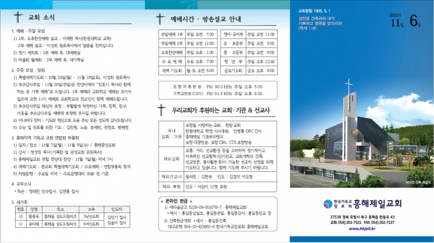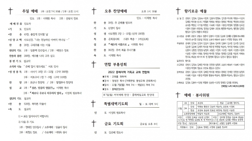 2. ÁÖÁß ¸ðÀÓ ¡¤ ¾Ë¸² 1) Ưº°»õº®±âµµÈ¸ : 10¿ù 24ÀÏ(¿ù) - 11¿ù 19ÀÏ(Åä), À̼ºÈñ ¿ø·Î¸ñ»ç 2) Ãß¼ö°¨»çÁÖÀÏ : 11¿ù 20ÀÏ(ÁÖÀÏ)Àº Âù¾ç»ç¿ªÀÚ ¡°¹ÎÈ£±â ¸ñ»ç¿Í ÇÔ²² ÇÏ´Â ¿Â °¡Á· ¿¹¹è¡±·Î µå¸³´Ï´Ù. 1ºÎ ¿¹¹è¿Í ±³È¸Çб³ ¿¹¹è´Â ¸ðÀÌÁö ¾ÊÀ¸¸ç ¿ÀÀü 11½Ã ¿¹¹è·Î ±³È¸Çб³¿Í Àü±³ÀÎÀÌ ÇÔ²² ¿¹¹èµå¸³´Ï´Ù. 3) Ãß¼ö°¨»çÁÖÀÏ Å½ÅÀÚ ÃÊû : ºÎȰÀý¿¡ ÀÛÁ¤ÇϽа¡Á·, ģô, Ä£±¸, ÀÌ¿ôÀ» Ãß¼ö°¨»çÁÖÀÏ ¿¹¹è¿¡ ÃÊÃ»ÇØ ÁÖ½Ã±æ ¹Ù¶ø´Ï´Ù. 4) ¾Æ³ª¹Ù´Ù ÀåÅÍ : ±âµµ¿Í Çå½ÅÀ¸·Î µµ¿ò ÁֽЏðµç ¼ºµµ²² °¨»çµå¸³´Ï´Ù. 5) ¼ö´É ¹× Áø·Î¸¦ À§ÇÑ ±âµµ : ±èÁøÇü, ³ëÀ±, ·ù¿¹ºó, ÀüâÁ¶, ÆíÇýÁ¤ 3. ÈïÇØÁö¿ª ±âµ¶±³ ±³È¸ ¿¬ÇÕȸ ºÎÈïȸ 1) ÀÏÀÚ/Àå¼Ò : 11¿ù 7ÀÏ(¿ù)-11¿ù 9ÀÏ(¼ö) / ÈïÇØÁß¾Ó±³È¸ 2) °»ç : Á¤¼ºÁø ¸ñ»ç(°Å·èÇÑ ºû ±¤¼º±³È¸ ÀºÅð¸ñ»ç) 3) ÈïÇØÁ¦Àϱ³È¸ ¿¬ÇÕ Âù¾ç´ë Âù¾ç : 11¿ù 7ÀÏ(¿ù) Àú³á 7½Ã 4) »õº®±âµµÈ¸ : º»±³È¸ Ưº°»õº®±âµµÈ¸ / ¼ö¿ä¿¹¹è : ¿¬ÇÕºÎÈïȸ Âü¼® 5) Â÷·®¿îÇà : ¼ö¿äÀÏ Àú³á – ¼ö¿ä¿îÇà´ëºñ 30ºÐ Àü ±âÁØ