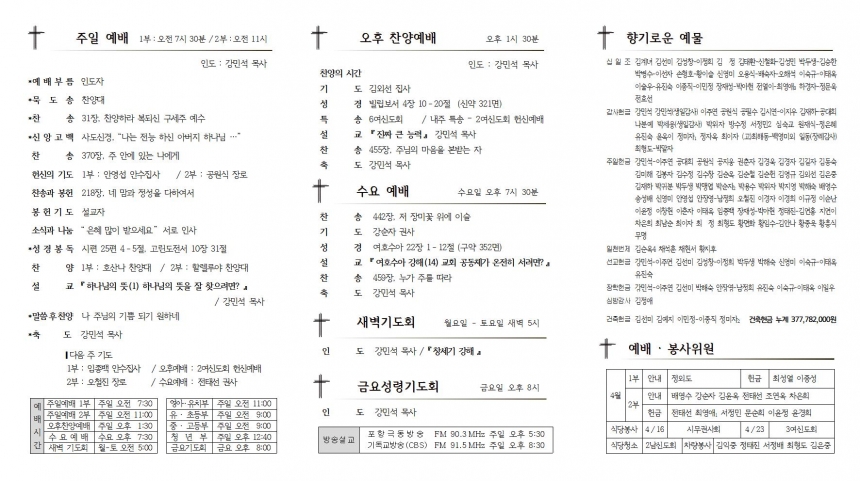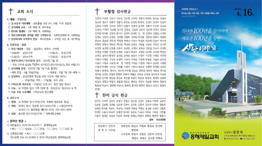 1. ¿¹¹è ÁÖÀϸðÀÓ 1) À¯¡¤ÃʵîºÎ ¾ß¿Ü¿¹¹è : ±³È¸Ãâ¹ß ¿ÀÀü 9½Ã 10ºÐ, Áö°î ¿µÀÏ´ë 2) À¯¾Æ¼¼·Ê ±³À° : 2ºÎ ¿¹¹è ÈÄ, À¯Ä¡ºÎ½Ç 3) ÇѳªÈ¸ ¿ù·Êȸ : 2ºÎ ¿¹¹è ÈÄ, ´ë¿¹¹è½Ç 4) Àü±³ÀÎüÀ°´ëȸ Áغñ¸¦ À§ÇÑ ±¸¿ªÀå¸ðÀÓ : ¿ÀÈÄÂù¾ç¿¹¹è ÈÄ, ´ë¿¹¹è½Ç 5) ´ãÀÓ¸ñ»ç¿Í »ç¿ªºÎ¼ ¸¸³² : º¹ÁöÀ§¿øÈ¸ / ±¸¿ªÀå ¸ðÀÓ ÈÄ, »õ°¡Á·½Ç 2. ÁÖÁ߸ðÀÓ ¾Ë¸² 1) ºÎÀÓ ´ë½É¹æ : ´ë¿ø - ´ãÀÓ¸ñ»ç, ºÎ¸ñ»ç, ±¸¿ªÀå ⦁18ÀÏ(È) : ³²¼º2±¸¿ª ⦁20ÀÏ(¸ñ) : ¿Á¼º2±¸¿ª ⦁21ÀÏ(±Ý) : ³²¼º4±¸¿ª ⦁22ÀÏ(Åä) : ¿Á¼º2±¸¿ª 2) Ç×Á¸Á÷(±Ç»ç/¾È¼öÁý»ç) ¼±°Å : 2023³â 7¿ù Áß - ÁÖº¸ °£Áö¿¡ »ðÀÔµÈ ¡ºÇ×Á¸Á÷ ¼±°Å°ø°í❙±Ç»ç/¾È¼öÁý»ç¡» ÂüÁ¶ ¹Ù¶ø´Ï´Ù. 3) À¯¾Æ¼¼·Ê ¾È³» : 2020³â 5¿ù 7ÀÏ ÀÌÈÄ Ãâ»ýÀÚ ⦁¼¼·Ê ¹®´ä : 4¿ù 30ÀÏ(ÁÖÀÏ) ⦁¼¼·ÊÀÏ : 5¿ù 7ÀÏ 2ºÎ ¿¹¹è ½Ã 4) ´ãÀÓ¸ñ»ç : ¿µ¼º°øµ¿Ã¼ Çü¼ºÀ» À§ÇÑ Áöµµ·Â °³¹ß ¼¼¹Ì³ª - 16ÀÏ(ÁÖÀÏ) Àú³á ~ 17ÀÏ(¿ù), ¿ì¸® ±³È¸ 5) 1¿©½ÅµµÈ¸ Ä£±³¸ðÀÓ : 22ÀÏ(Åä) ¿ÀÀü 8½Ã, ¹Ð¾ç ¿µ³² ¾ËÇÁ½º 6) ³ª´® : ͺ ¹Ú¸íÈ Áý»ç °¡Á· (Àå·Ê Áß À§·Î°¨»ç), Á¡½É½Ä»ç & ¶± 7) ´ÙÀ½ ÁÖÀÏ ¿ÀÈÄ¿¹¹è : 2¿©½ÅµµÈ¸ Çå½Å¿¹¹è 3. ±³¿ì¼Ò½Ä 1) Àå·Ê : ͺ ¹Ú¸íÈ Áý»ç(¾à¼º2±¸¿ª, ¹ÚÃ¶È ¿ø·ÎÀå·Î Çü´Ô) 2) °³¾÷ : ¿øÀç½Ä Áý»ç, Á¤ÀºÇý Áý»ç(³²¼º2±¸¿ª) / ½Ã°ñ±èÄ¡Âî°³ ³²¼º¸® (±¸. µ¹ÇÉȽÁý) ¢Ï262-2010, 010-4541-8099 3) ÀÔ¿ø : Ȳ¼öÇ⠱ǻç(¸¶»ê2±¸¿ª) / °æºÏ´ëÇб³º´¿ø